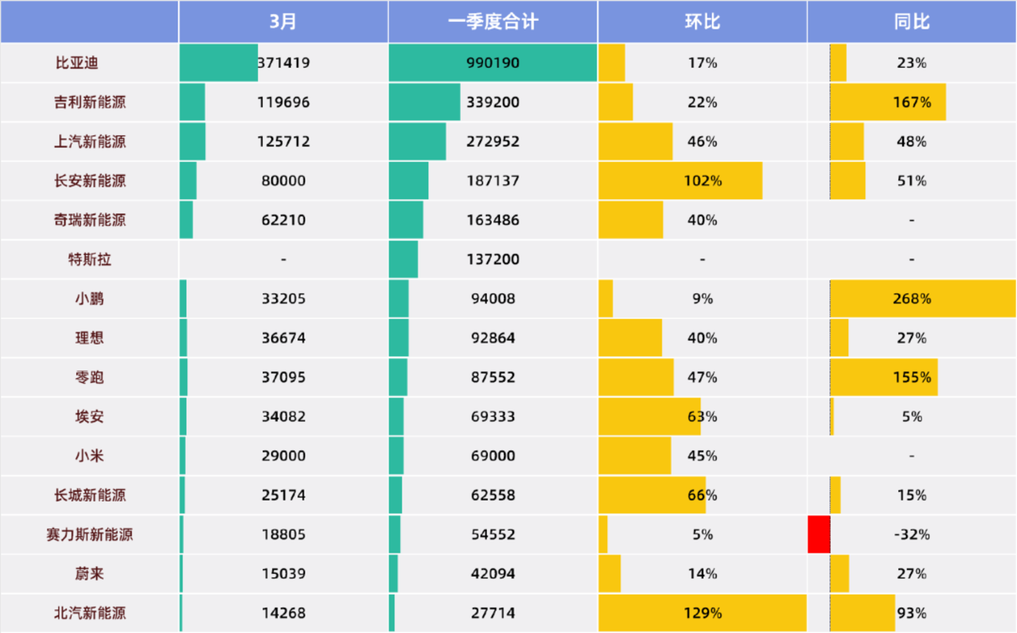 通常而言,第一季度是车企的销量淡季,多数车企的销量都会有明显下滑。从3月开始,新能源车企的销量开始逐月攀升。