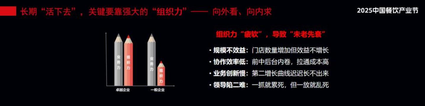 上面一张图是餐企在规模发展过程中,可能出现的4种典型现象。正因如此,餐企会因组织力疲软而“未老先衰”,平均寿命低于大部分行业。很多朋友归结为顾客的喜新厌旧,但真正的问题还是出在自己身上,卓越餐饮企业一定能做到基业长青。