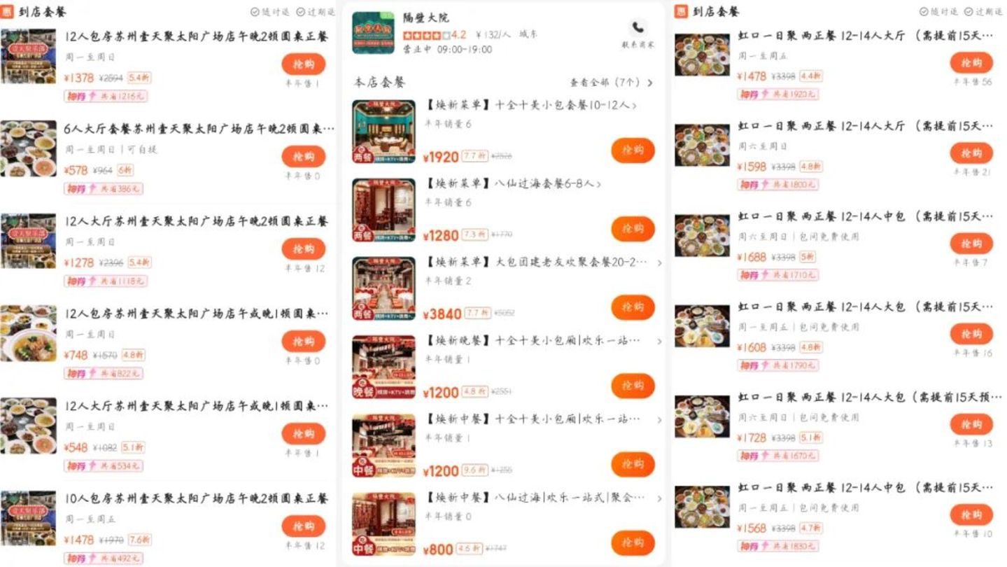 “百元一日聚”的热度越来越高,部分传统酒楼也开始推出相关套餐,比如苏州的大鸿运大酒店、五福楼大酒店,无锡的迎宾楼,宁波的宁波宴,南京的雁城味道等。