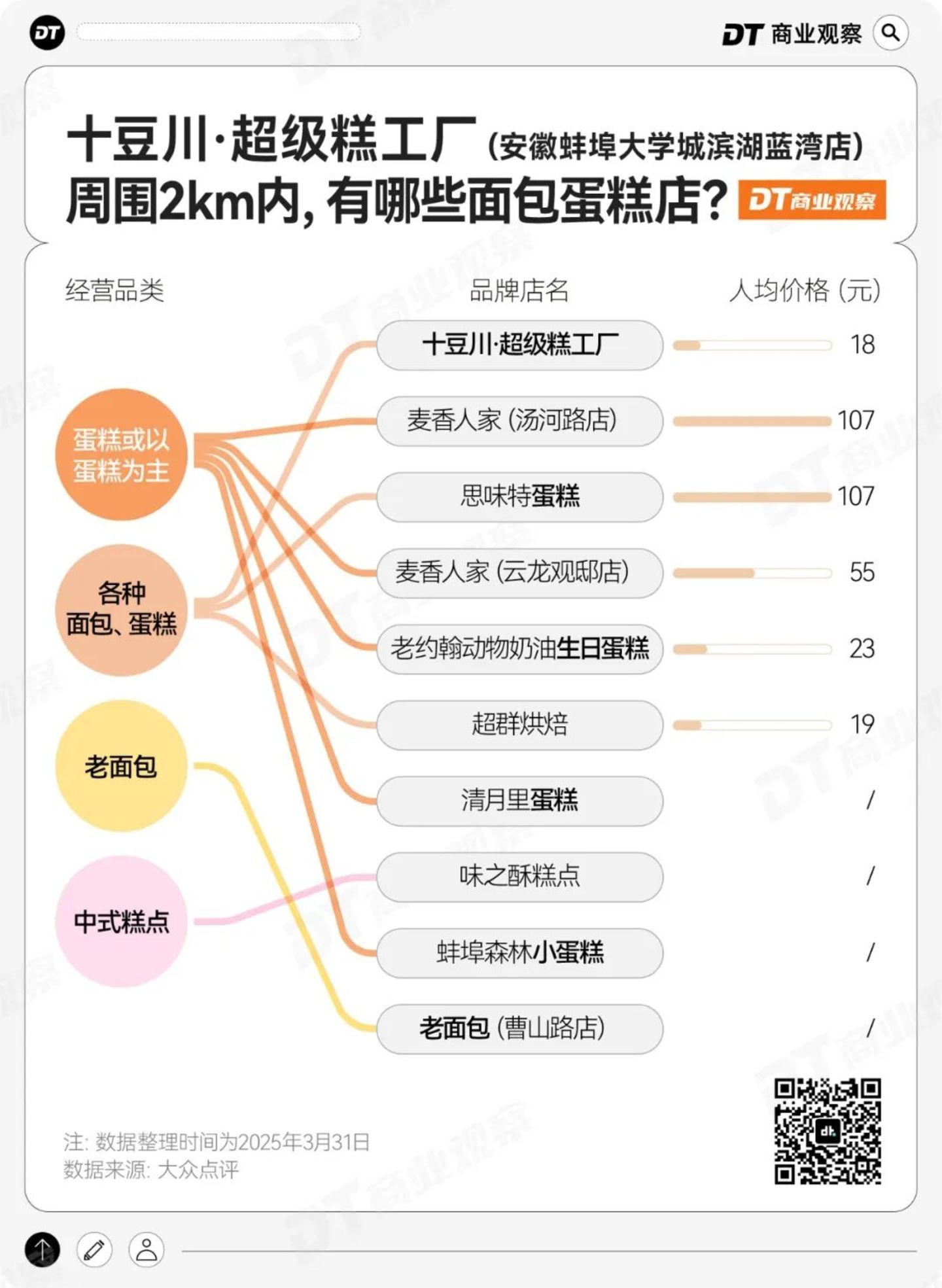 以十豆川超级糕工厂在安徽蚌埠的大学城店为例,该门店2km范围内面包烘焙店一共有9家,其中5家都是以蛋糕为主要品类,1家是中式糕饼店、1家专注卖老面包,剩下两家虽然品类多,但人均价格均高于十豆川。