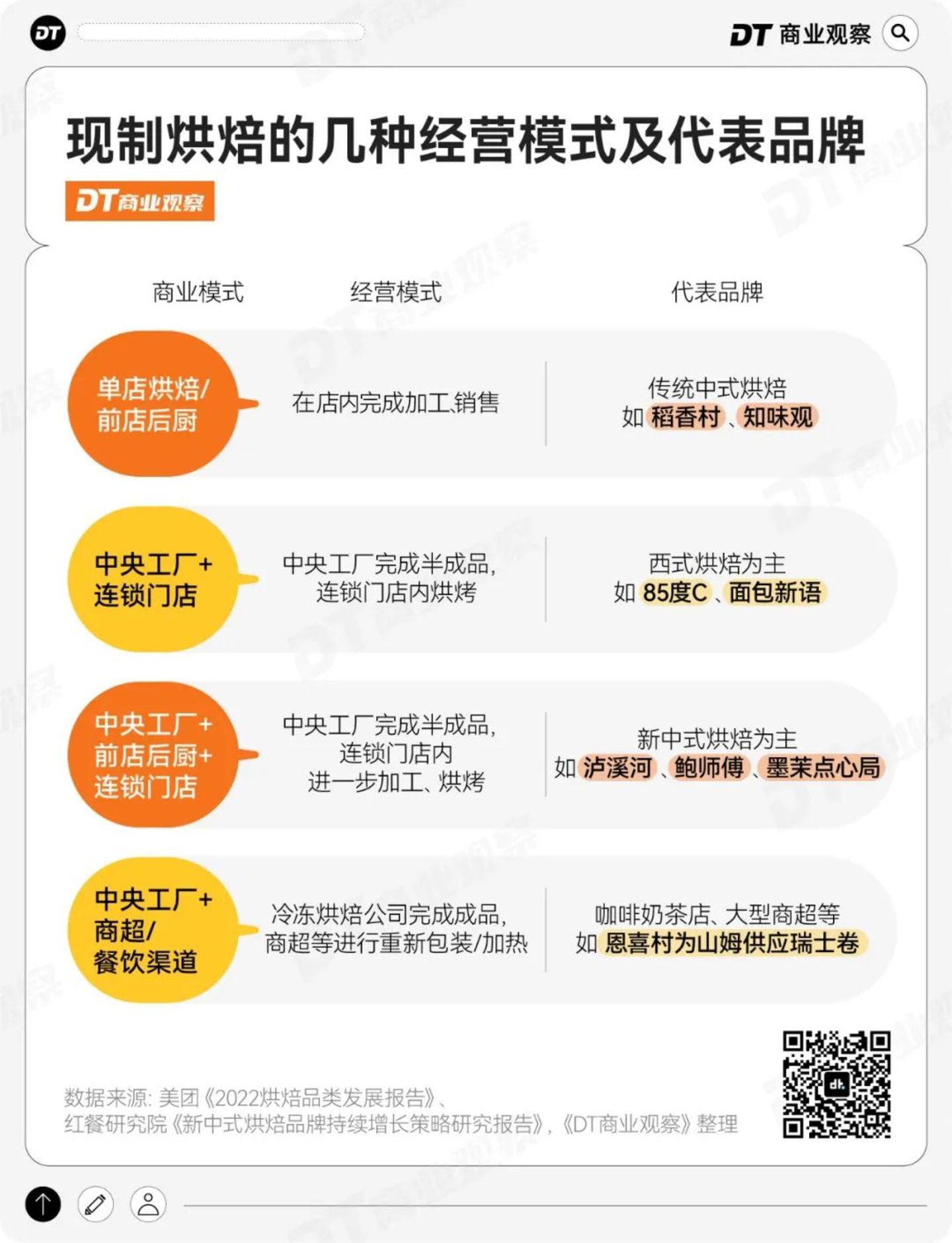 综合美团《2022烘焙品类发展报告》和红餐研究院数据,现制烘焙的门店大概有以下几种模式: