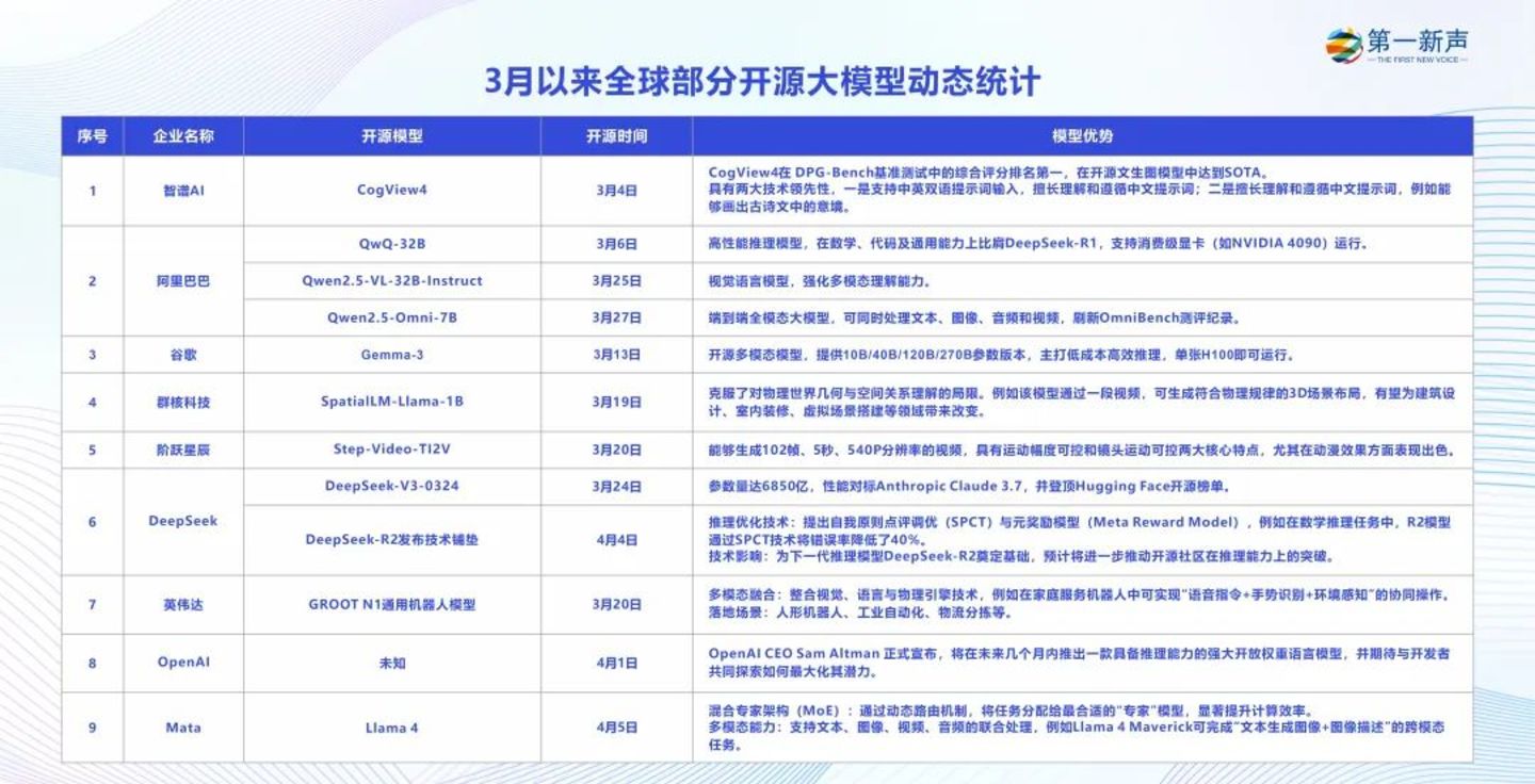 据不完全统计,仅今年3月至今,OpenAI、谷歌、Meta、英伟达、阿里、DeepSeek、智谱AI、群核科技、阶跃星辰等全球9家科技巨头已密集发布超10款开源大模型。并且,开源模型性能不断突破,全球最大AI开源社区Hugging Face的模型榜单持续刷新……无论是科技巨头还是初创企业,都在加速拥抱开源。