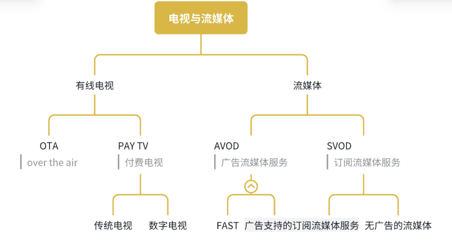 现在美国流行一种FAST流媒体服务,即FreeAd-SupportedStreamingTV(广告支撑的免费流媒体电视),它是AVOD流媒体的子集。福克斯和派拉蒙等传统媒体公司分别通过Tubi和PlutoTV提供FAST服务。Roku、LG、三星和Vizio等电视设备制造商也拥有自己的FAST平台。我做了一个图示,表示各个电视广告媒介的关系。