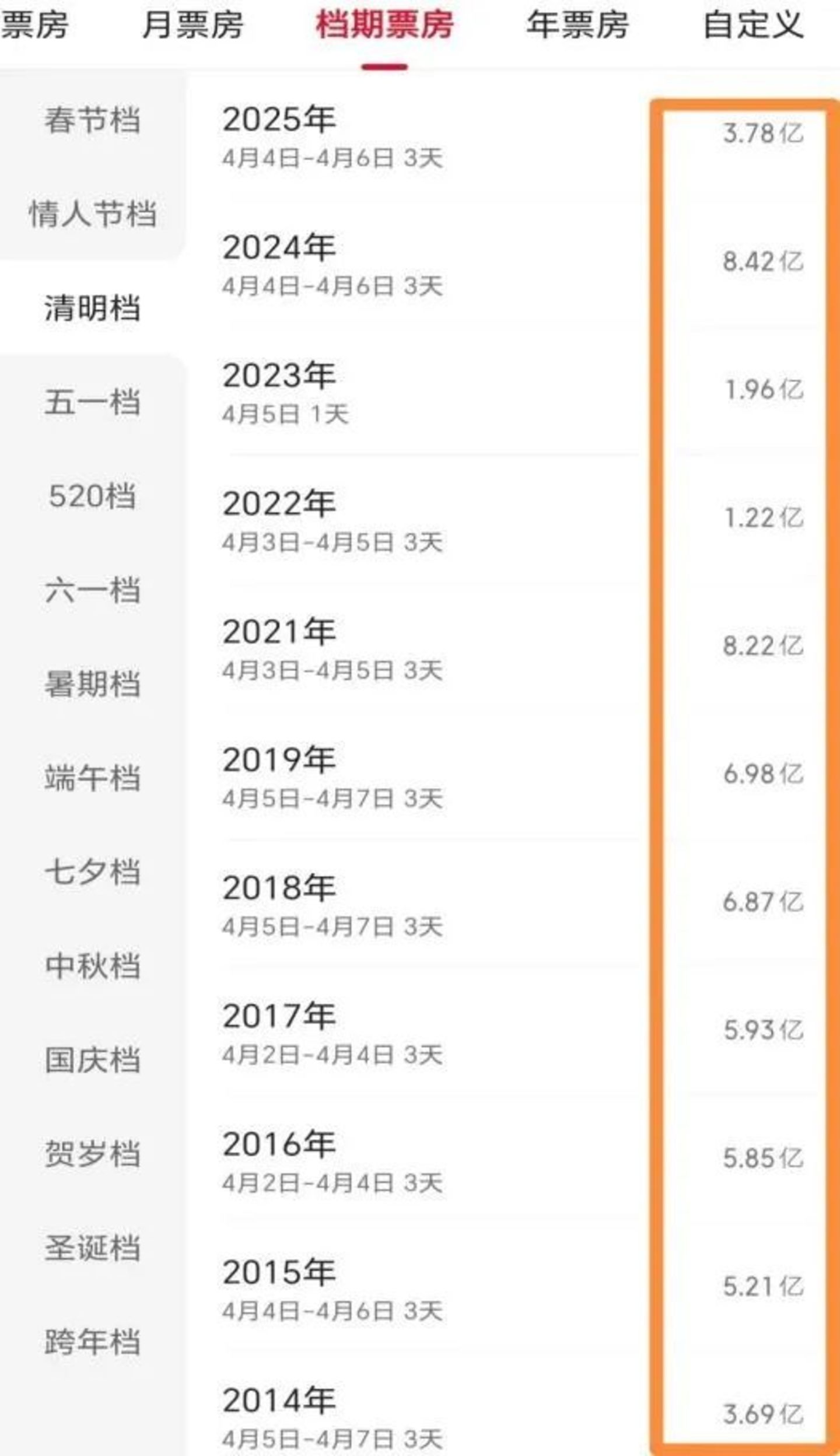 3.78亿,在过去十年的清明档中,仅好于2022年和2023年,而前者因为疫情原因,没有一部新片上映,后者是近十年唯一只有一天的清明档。换言之,今年清明档是近十年最差。