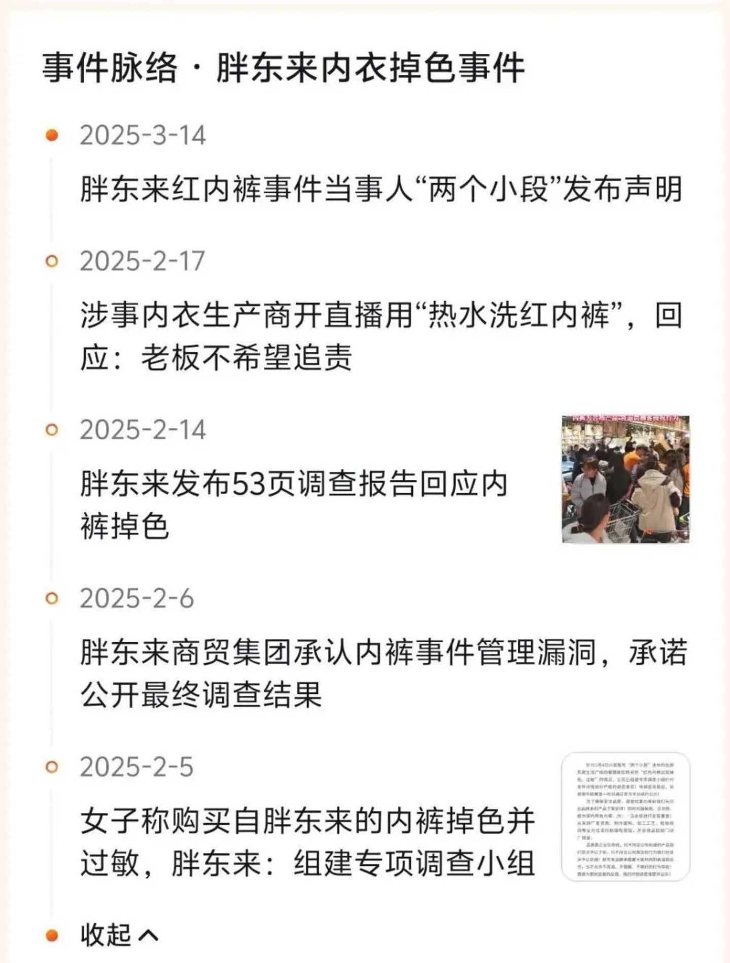 2月14日,胖东来官方抖音号发布长达53页的《关于“红色内裤掉色、过敏以及部门处理过程”的调查报告》。《调查报告》称,综合三家检测机构检测结果可以认定,胖东来服装部销售的中山市民伟制衣有限公司旗下“富妮来品牌”女士基础舒适内裤为合格商品。