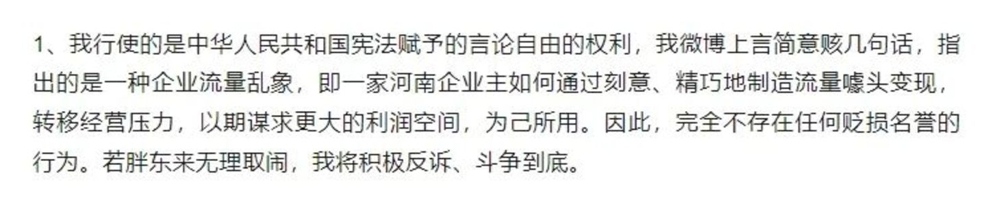 胖东来称上述言论涉嫌对胖东来公司品牌形象进行贬损,追责金额不低于100万。