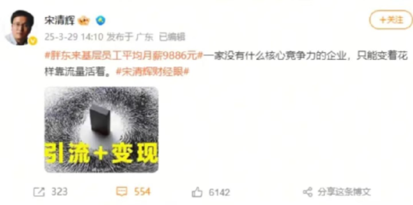“宋清辉”微博账号中曾多次发表关于胖东来的评论,曾在“胖东来基层员工平均月薪9886元”的微博超话词条中评论“胖东来是一家没有什么核心竞争力的企业,只能变着花样靠流量活着”。