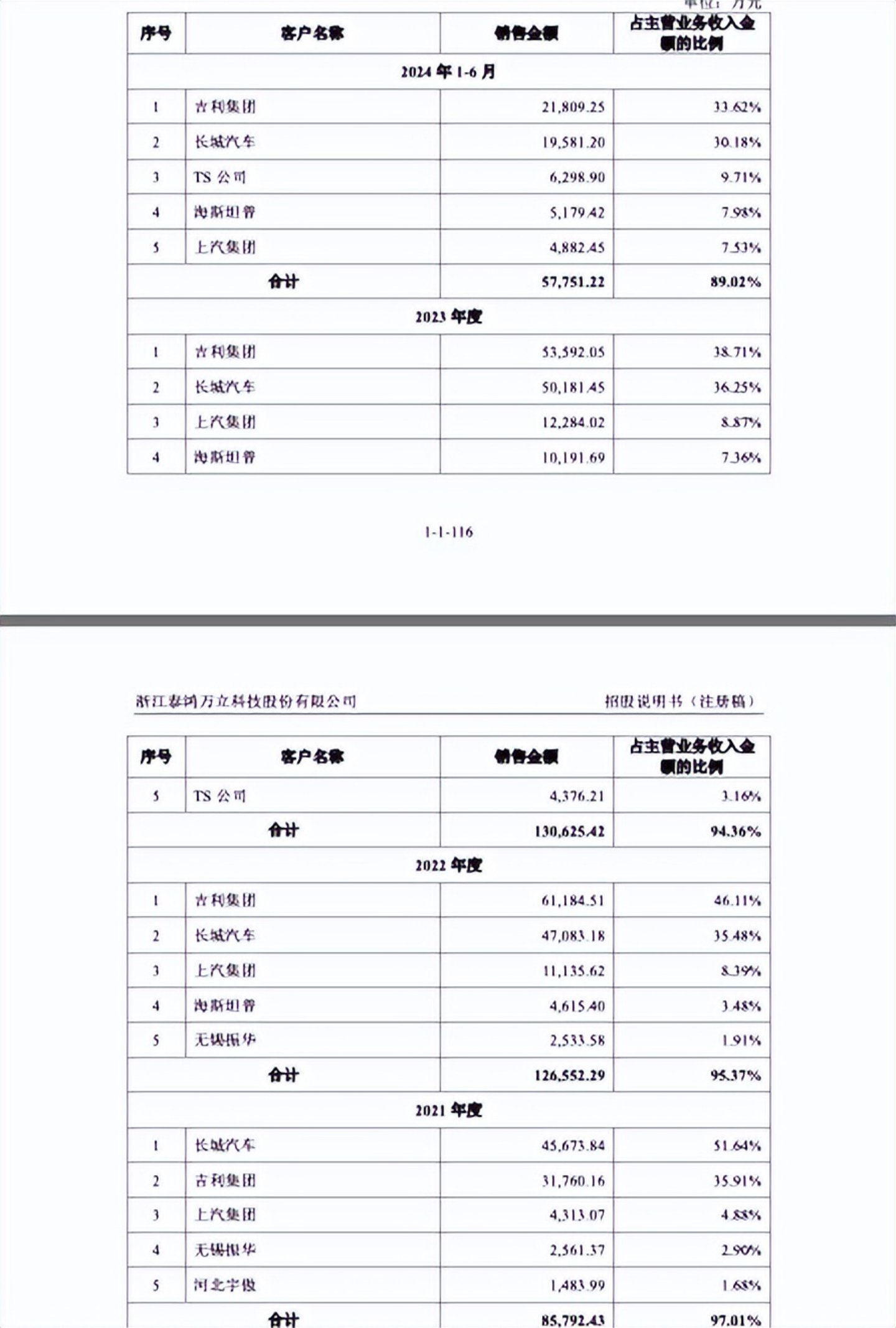 招股书显示,2021-2023年及2024年上半年(下称:报告期),泰鸿万立对吉利集团的主营业务收入占比分别达35.91%、46.11%、38.71%、33.62%,源于长城汽车的收入贡献则依次为51.64%、35.48%、36.25%、30.18%。