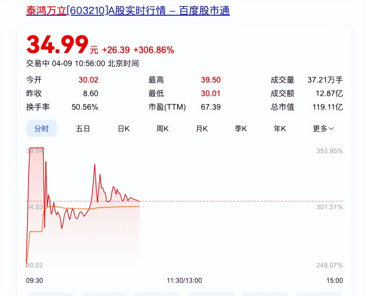 今日开盘,泰鸿万立报30.02元/股较发行价8.6元/股大涨249.07%,总市值约102.19亿元。截至发稿,其股价最高触及39.5元/股,涨幅高达359.30%,据此计算总市值约134.46亿元。