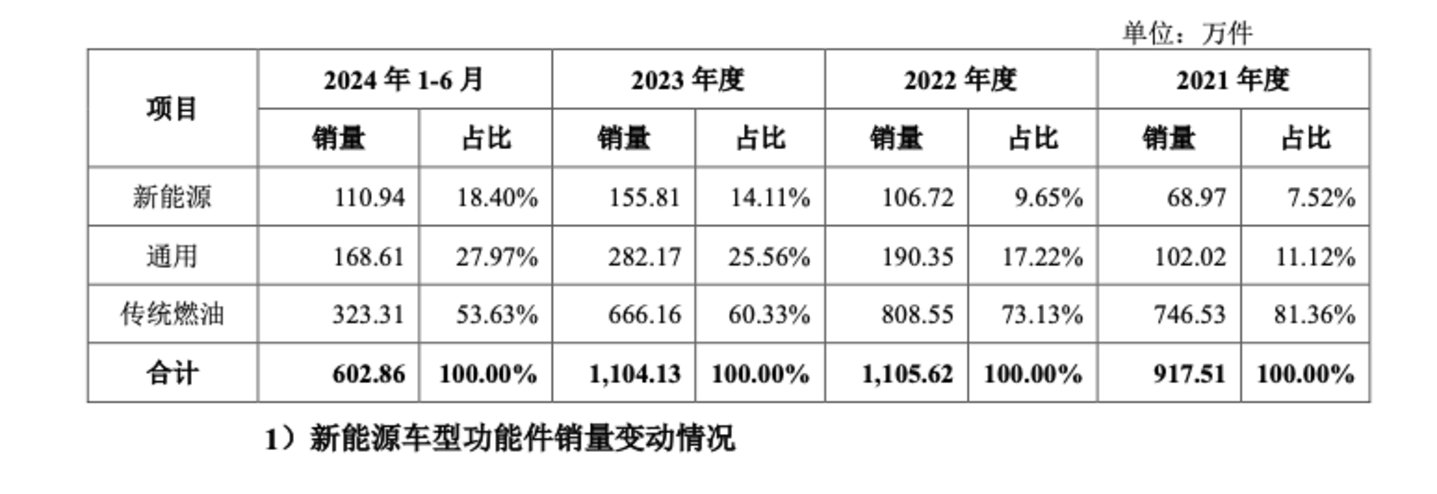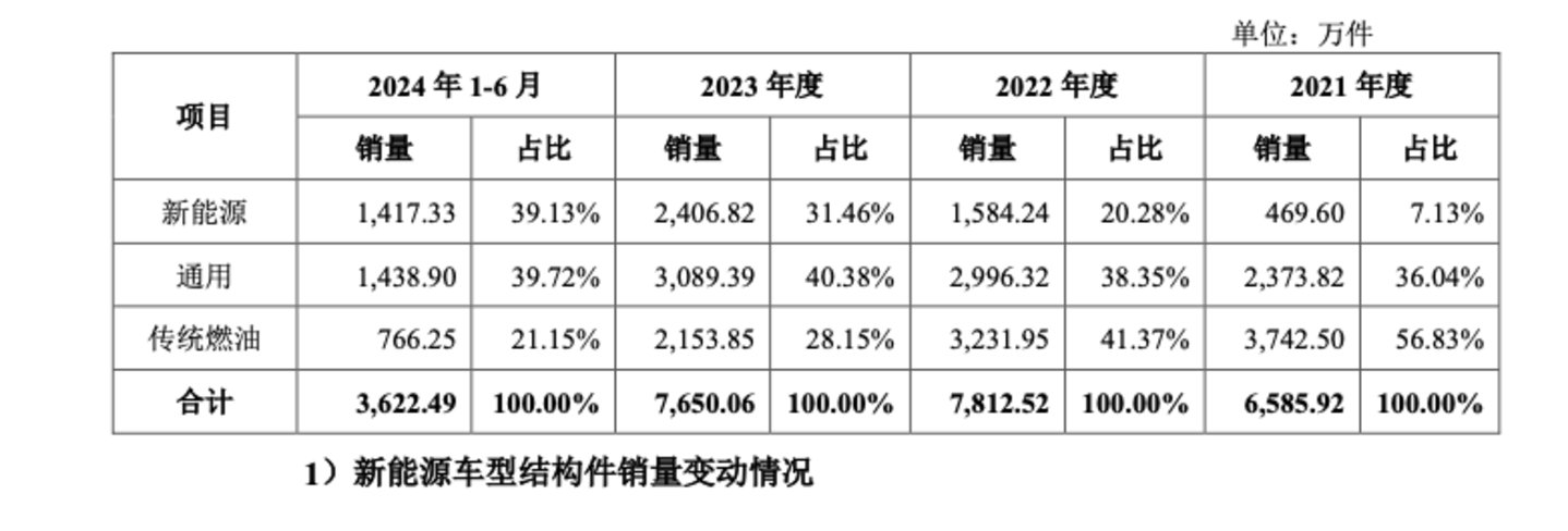 报告期内,泰鸿万立新能源车型结构件销量分别为469.60万、1584.24万、2406.82万、1417.33万件,占结构件销量的比例分别为7.13%、20.28%、31.46%、39.13%。