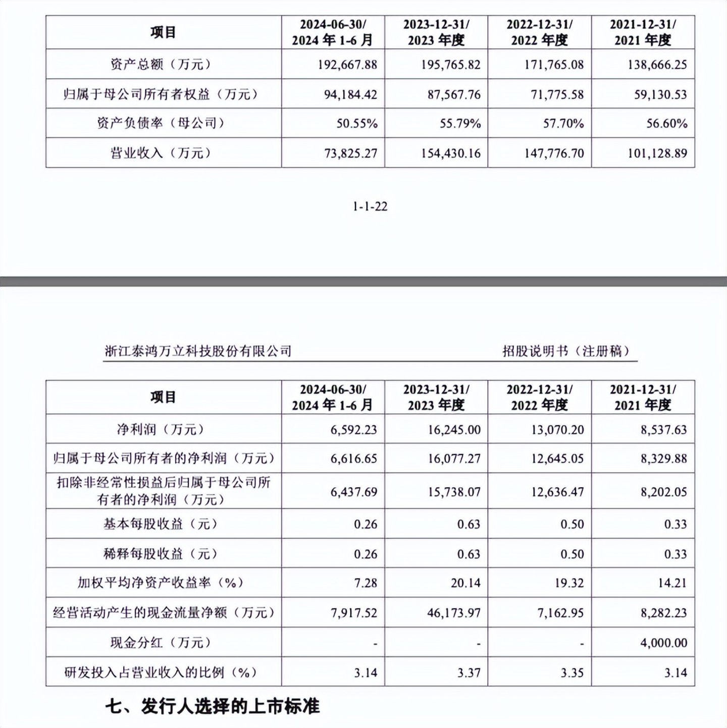 2024年,泰鸿万立(经容诚会计师事务所审阅未审计)营业收入约16.89亿元,同比增长9.35%;归母净利润约1.77亿元,同比增长9.93%。