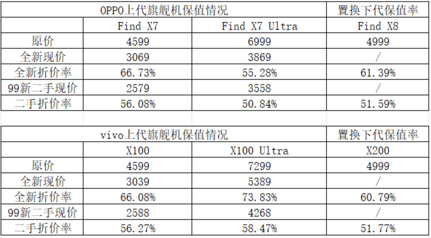 为保证统计的一致性,在OPPO与vivo旗舰机保值率的统计上,我们选择了上一代标准旗舰Find X7、X100与影像旗舰Find X7 Ultra和 X100 Ultra的16G+512G版本。