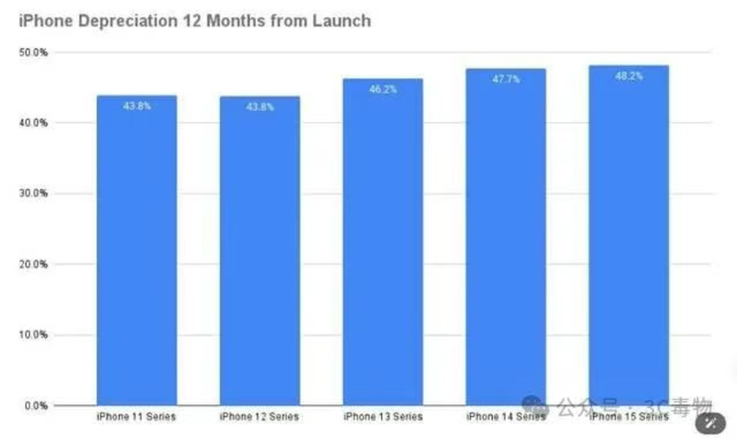 据3C毒物报道,有数据据统计显示,从iPhone11系列开始,每发布一款新iPhone,贬值率就会提升:其中iPhone11贬值率为43.8%,iPhone12贬值率为43.8%,iPhone13贬值率为46.2%,iPhone14贬值率为47.7%,iPhone15贬值率为48.2%。