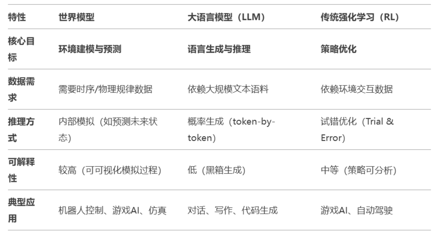 模型结构层面,大语言模型主要依赖Transformer架构,通过自注意力机制处理文本序列。世界模型则包含多个模块,如配置器、感知、世界模型、角色等,能够估计世界状态、预测变化、寻找最优方案。
