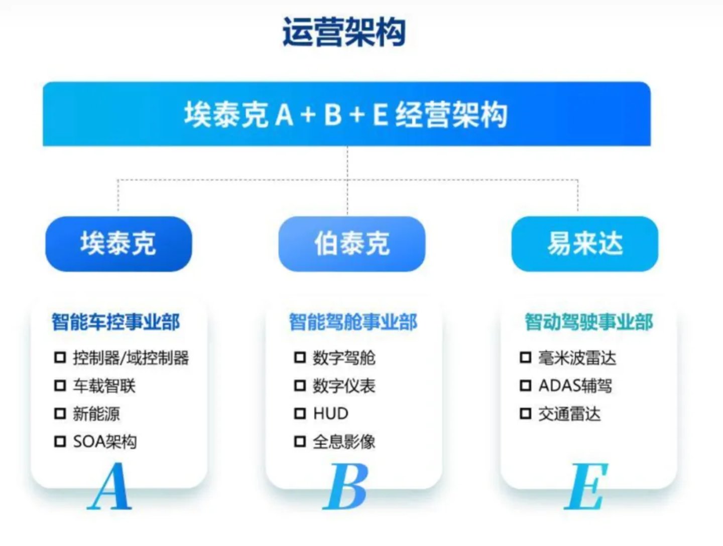 埃泰克成立于2003年,下辖智能车控(埃泰克)、智能驾舱(伯泰克)、智动驾驶(易来达)等多个事业部,主营业务包括车身智控电子产品、智能驾舱电子产品、智动驾驶产品三大类,与德赛西威产品线相似,客户包括长安、奇瑞、北汽、华为、理想、小鹏等。