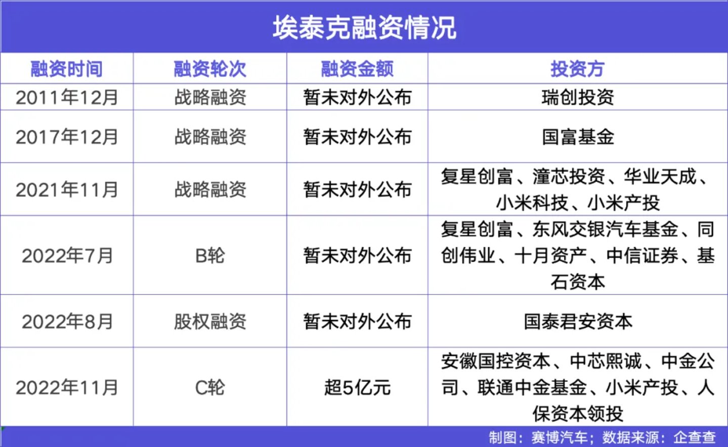 除了来自奇瑞的早期投资,小米旗下资本公司也先后参与了埃泰克两轮融资。第一次为2021年11月,为小米在官宣造车后的投资标的之一;第二次于2022年11月追加领投,这也让埃泰克备受外界关注。