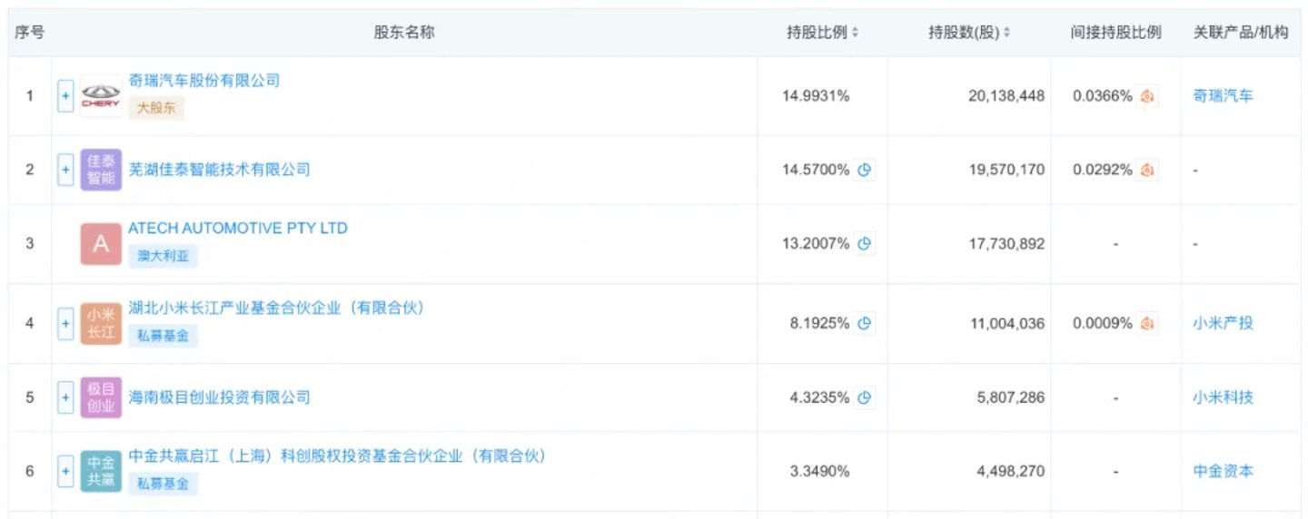 作为一家外合资企业,芜湖佳泰智能技术有限公司(芜湖佳泰)以及Atech Automotive Pty Ltd.(澳洲埃泰克)同受Chen Zejian(陈泽坚)控制,合计持有埃泰克股份比例为27.77%。除此之外,奇瑞和小米的关联企业也都先后入股了埃泰克,成为重要股东。