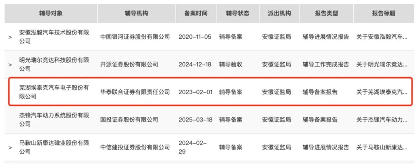 近日,芜湖埃泰克汽车电子股份有限公司(以下简称“埃泰克”)上市辅导备案申请获受理,华泰联合证券保荐,即将冲刺A股。