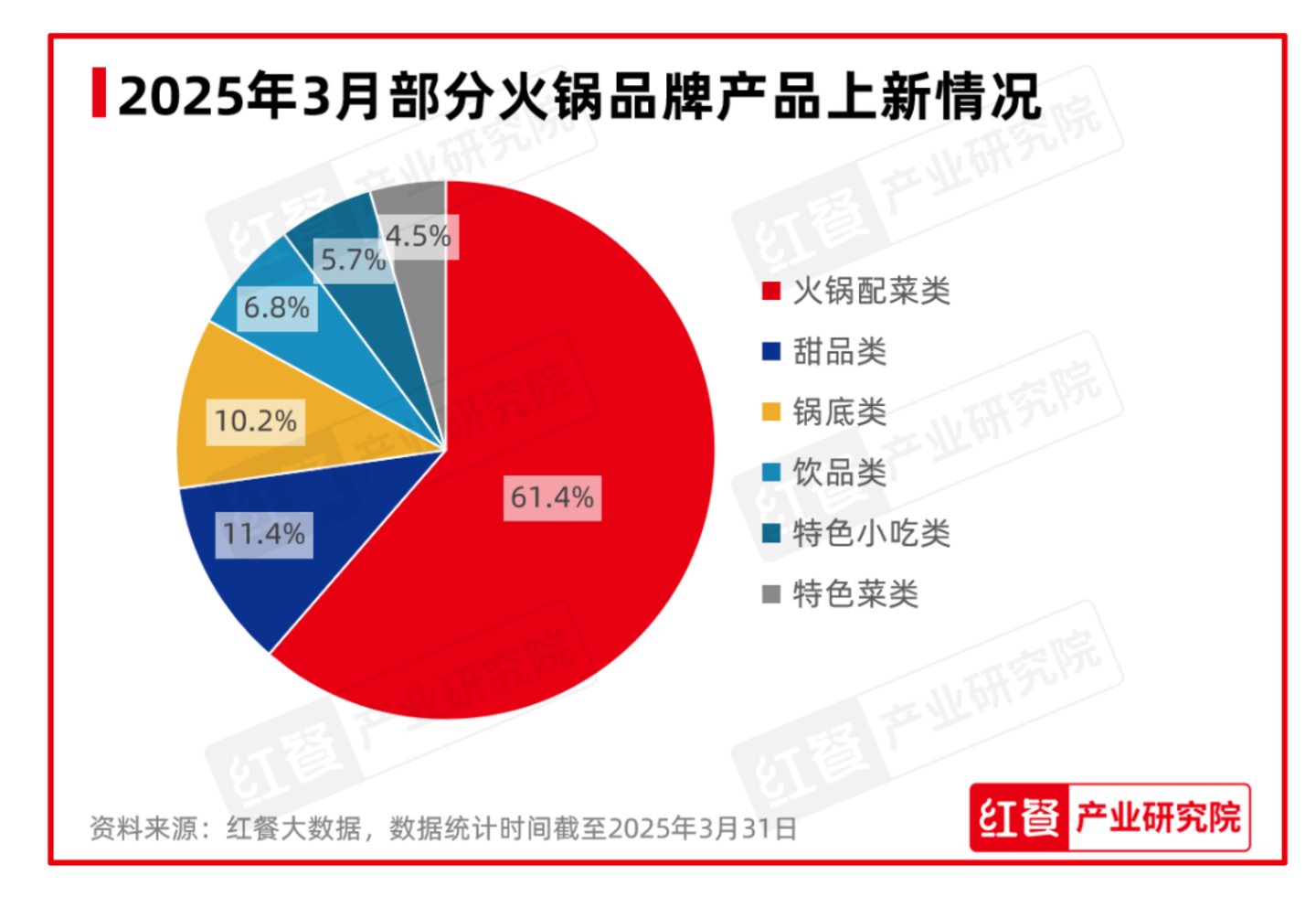 2025年3月,在红餐产业研究院监测的火锅品牌中,有22个火锅品牌共推出了88款新品。从新品的细分类别来看,当月火锅新品涵盖的类别有火锅配菜类、甜品类、饮品类、锅底类、特色小吃类和特色菜类。