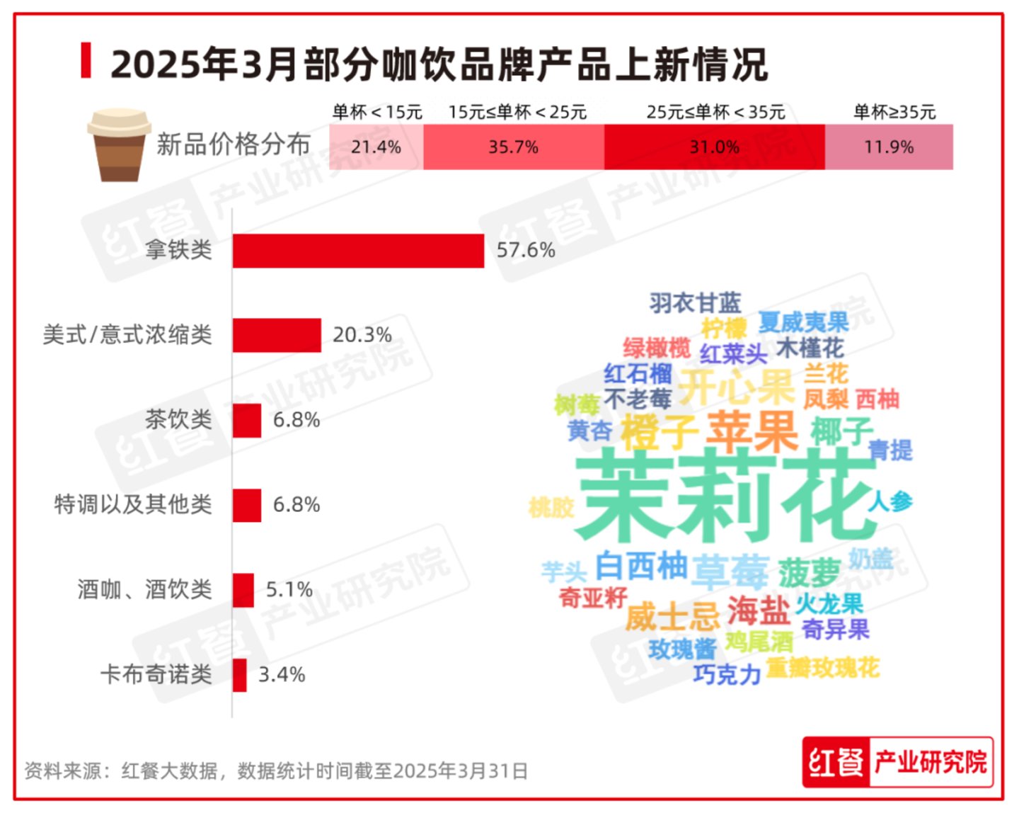 2025年3月,红餐产业研究院监测到有18个品牌共推出了59款新品。其中,拿铁类新品最多,共34款新品,占新品总量的57.6%;其次是美式/意式浓缩类新品,推出了12款新品,占比为20.3%。