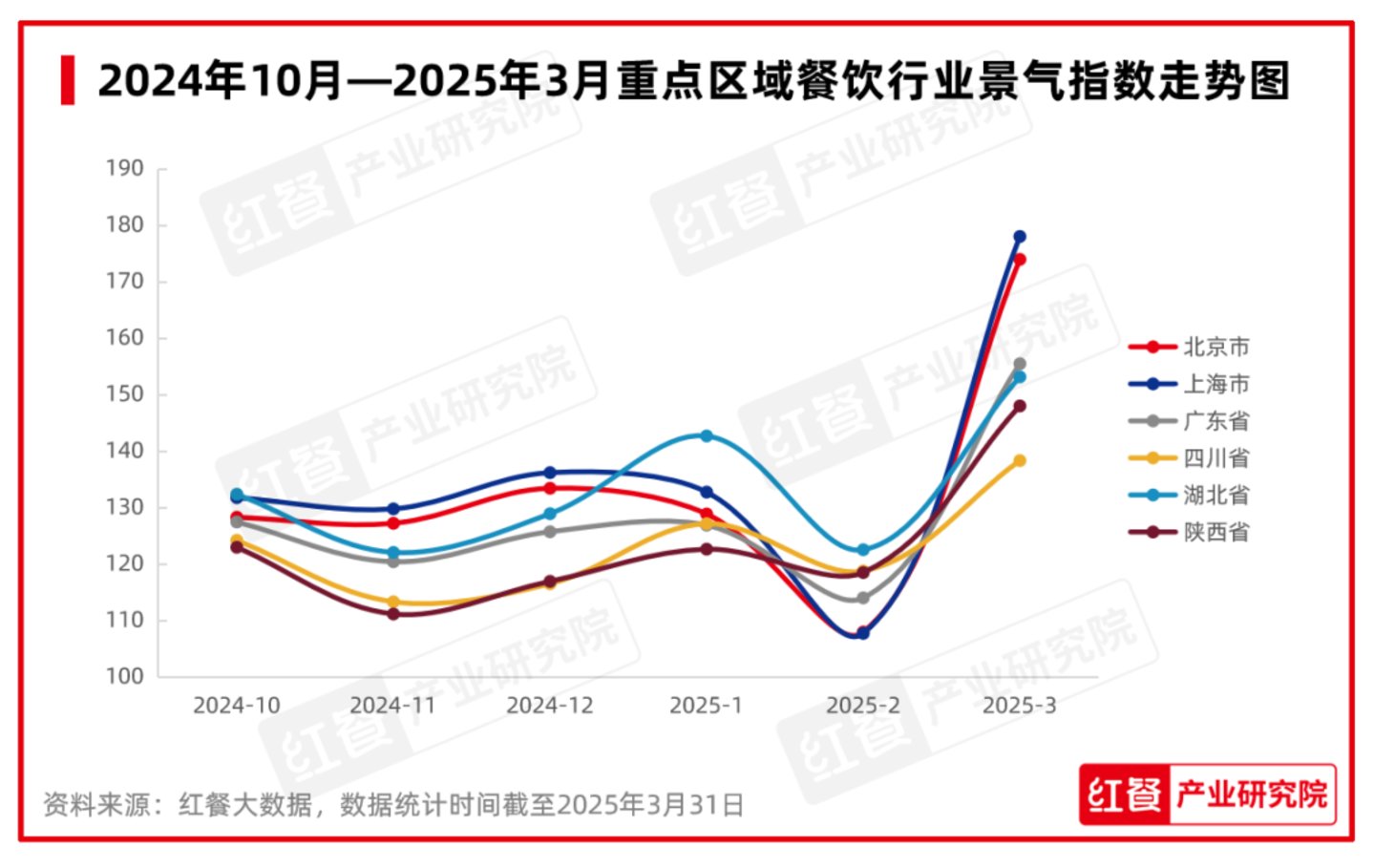 2025年3月,北京、上海、广东、四川、湖北、陕西等6个重点区域的餐饮行业景气指数均呈现上升趋势。