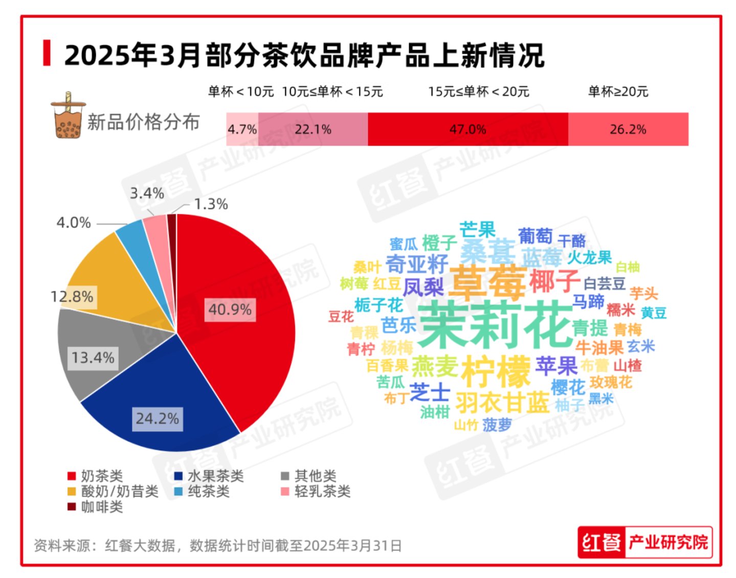从价格分布来看,3月茶饮品牌的新品价格整体小幅上涨,主要集中在15元≤单杯<20元和单杯≥20元两个区间内,占比分别为47.0%和26.2%。