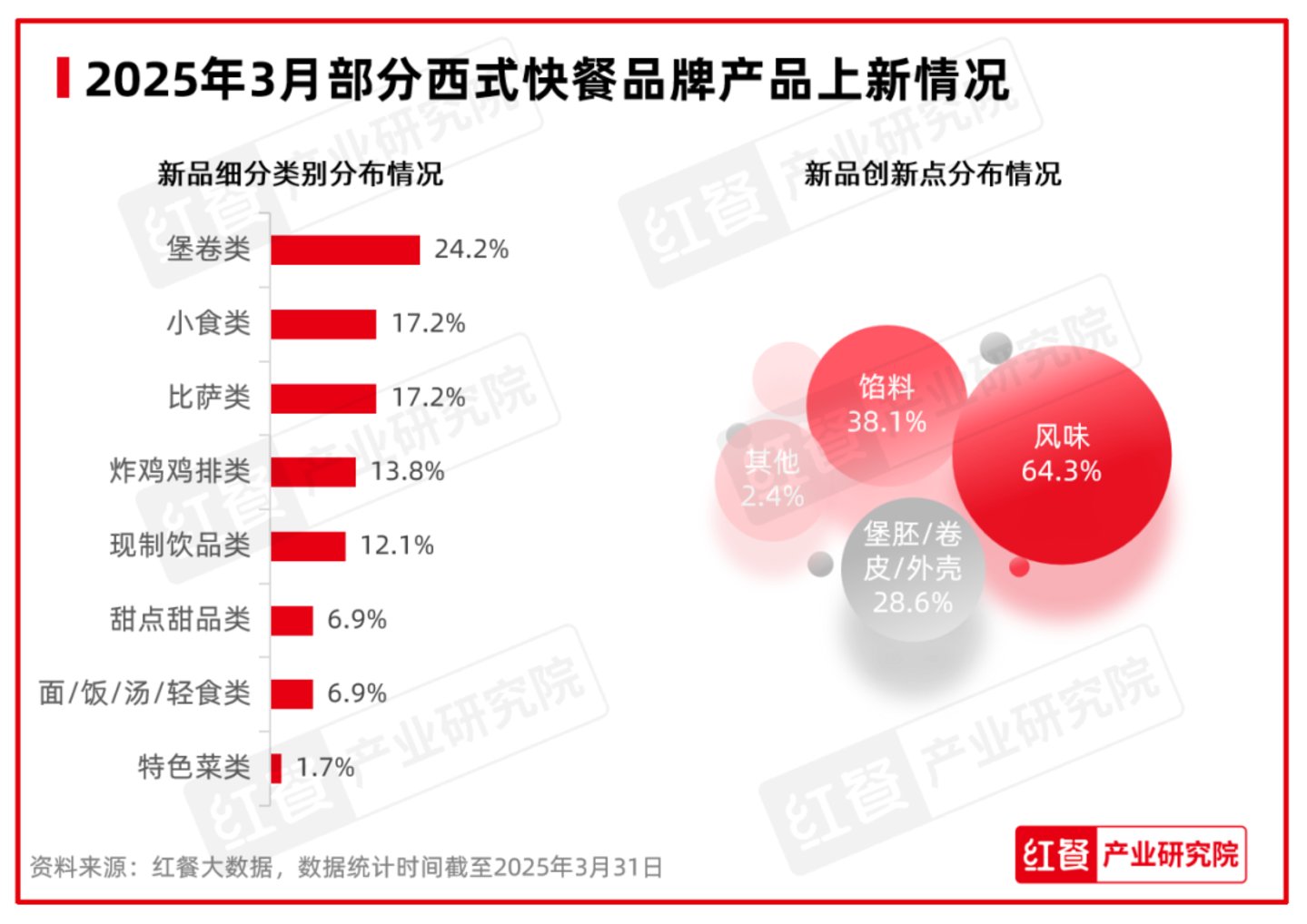 2025年3月,红餐产业研究院监测的西快品牌数量为45个。其中,有15个西式快餐品牌共推出了58款新品,环比上升13.7%。