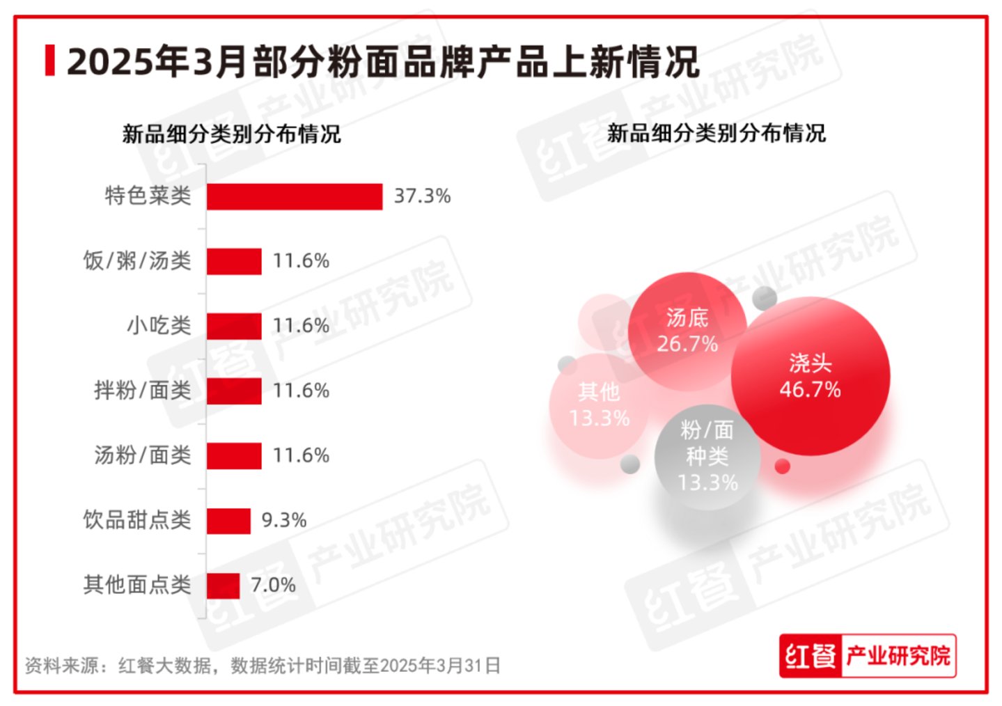 2025年3月,在红餐产业研究院监测的61个粉面品牌中,有13个粉面品牌共推出了43款新品。