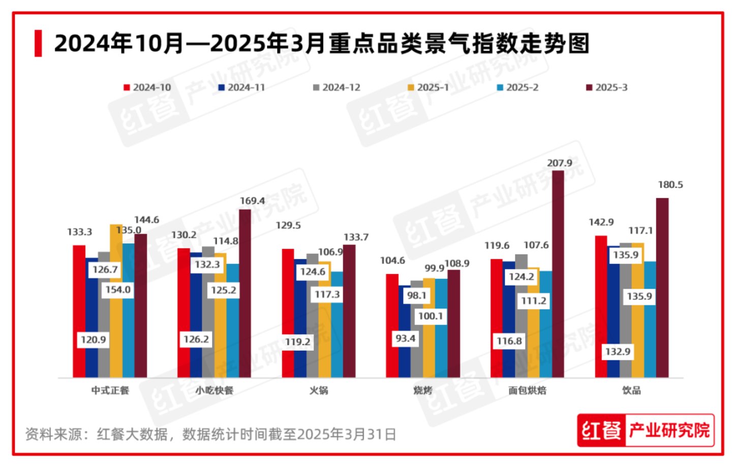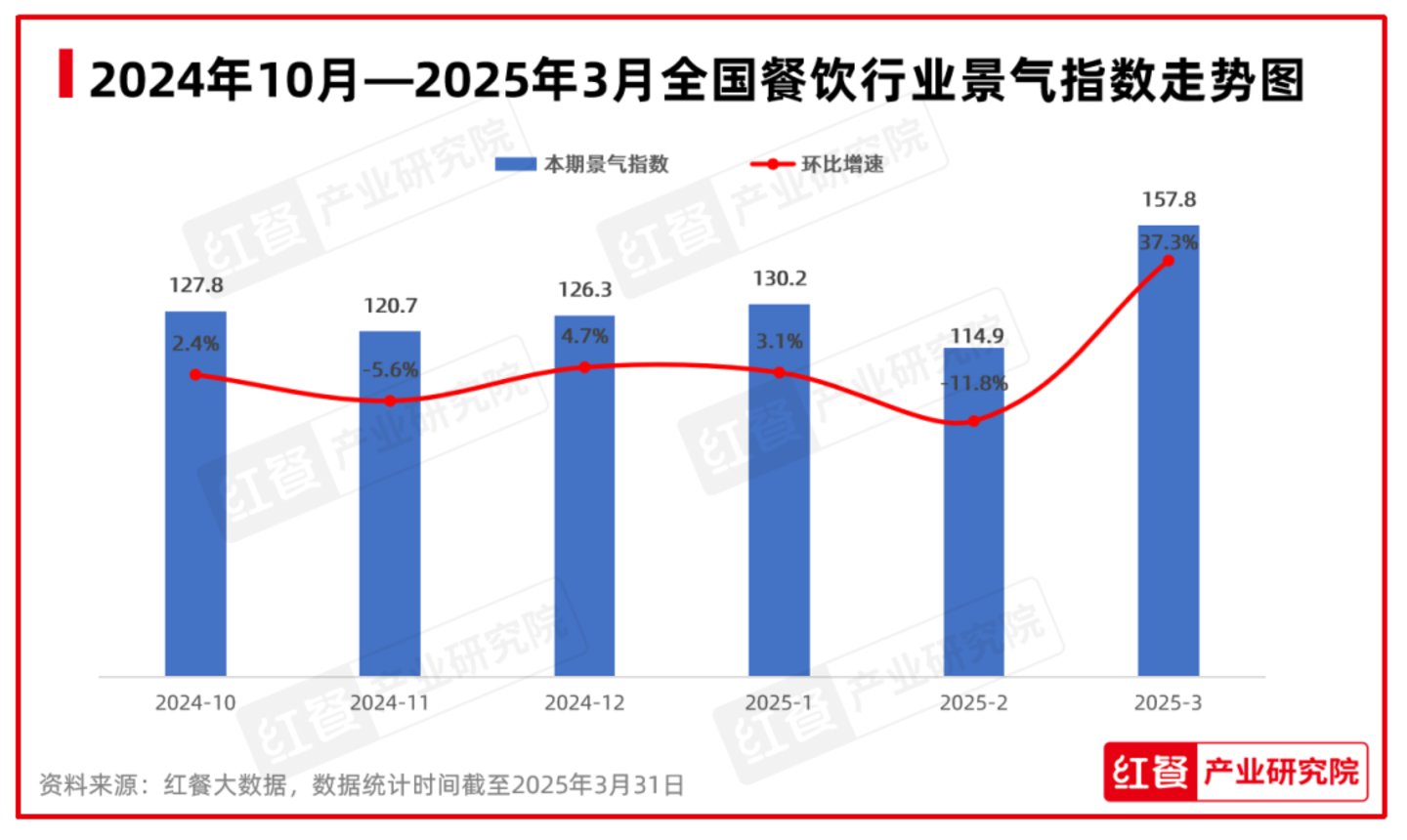 2025年3月,伴随全面复工复产加速与开学季带来的刚性消费需求,叠加气温回暖催生的“春日经济”效应,全国餐饮市场迎来爆发式增长。户外堂食、轻食、饮品等季节性消费热度攀升,商务宴请、家庭聚餐同步复苏,多重动能推动行业景气指数突破性上行。