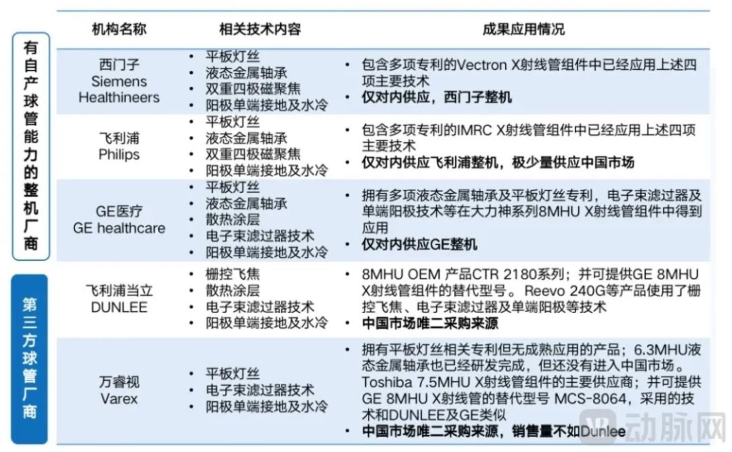 中标企业分为两类:一类是有自产球管能力的整机厂商,包括西门子、飞利浦、GE医疗;一类是第三方球管厂家,包括当立(DUNLEE)、万睿视(Varex)。