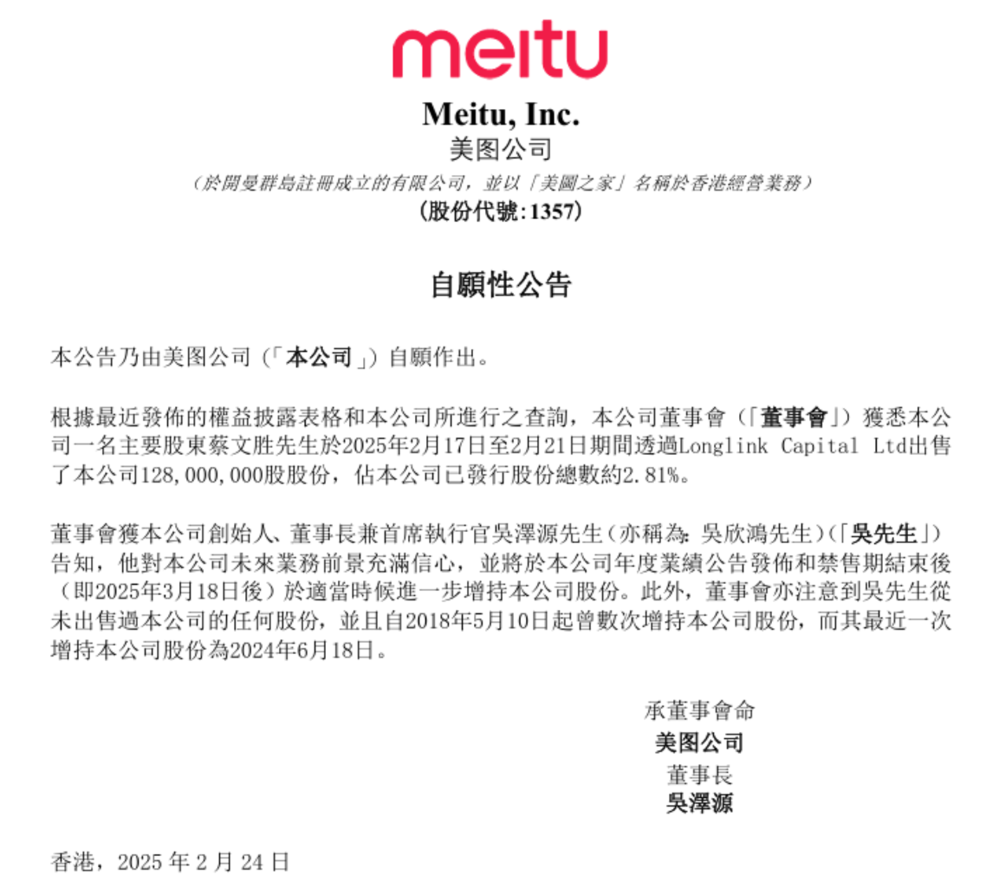 今年2月,美图公布业绩预增的消息后,其股价迎来上涨,但就在这一阶段,创始人蔡文胜却通过Longlink Capital Ltd减持了公司股份1.28亿股,累计套现约7.28亿元人民币,其持股比例也进一步“缩水”。