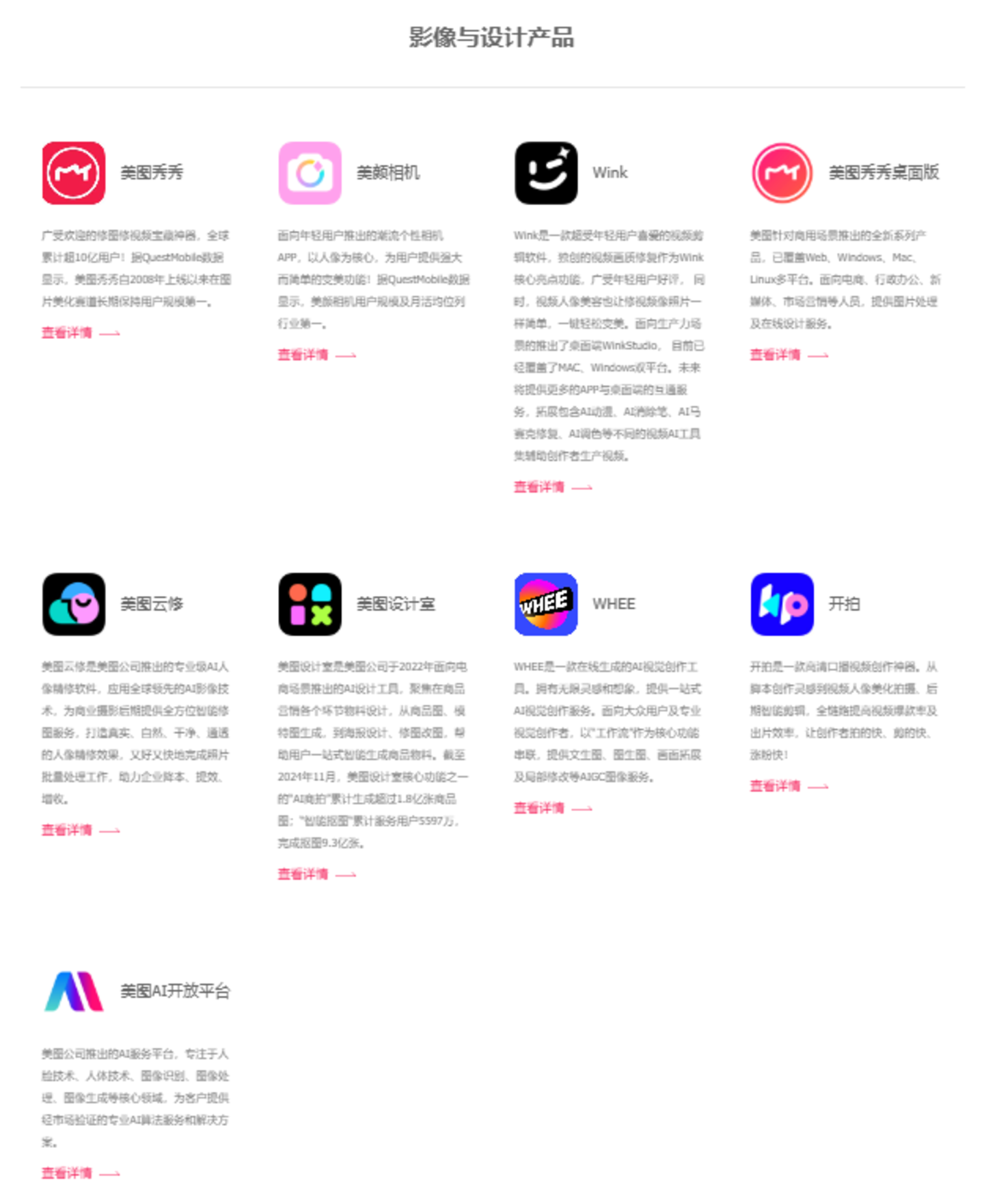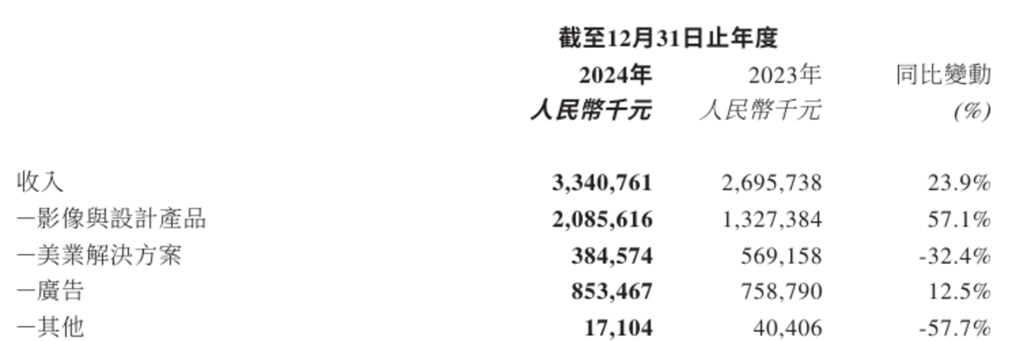 从2024年情况来看,美图年内实现营收33.4亿元,其中影像与设计产品收入就同比增长57.1%至20.9亿元,占比达6成以上。这一数值下,美图产品矩阵的付费订阅用户达1261万人次,付费渗透率也提升至4.7%。