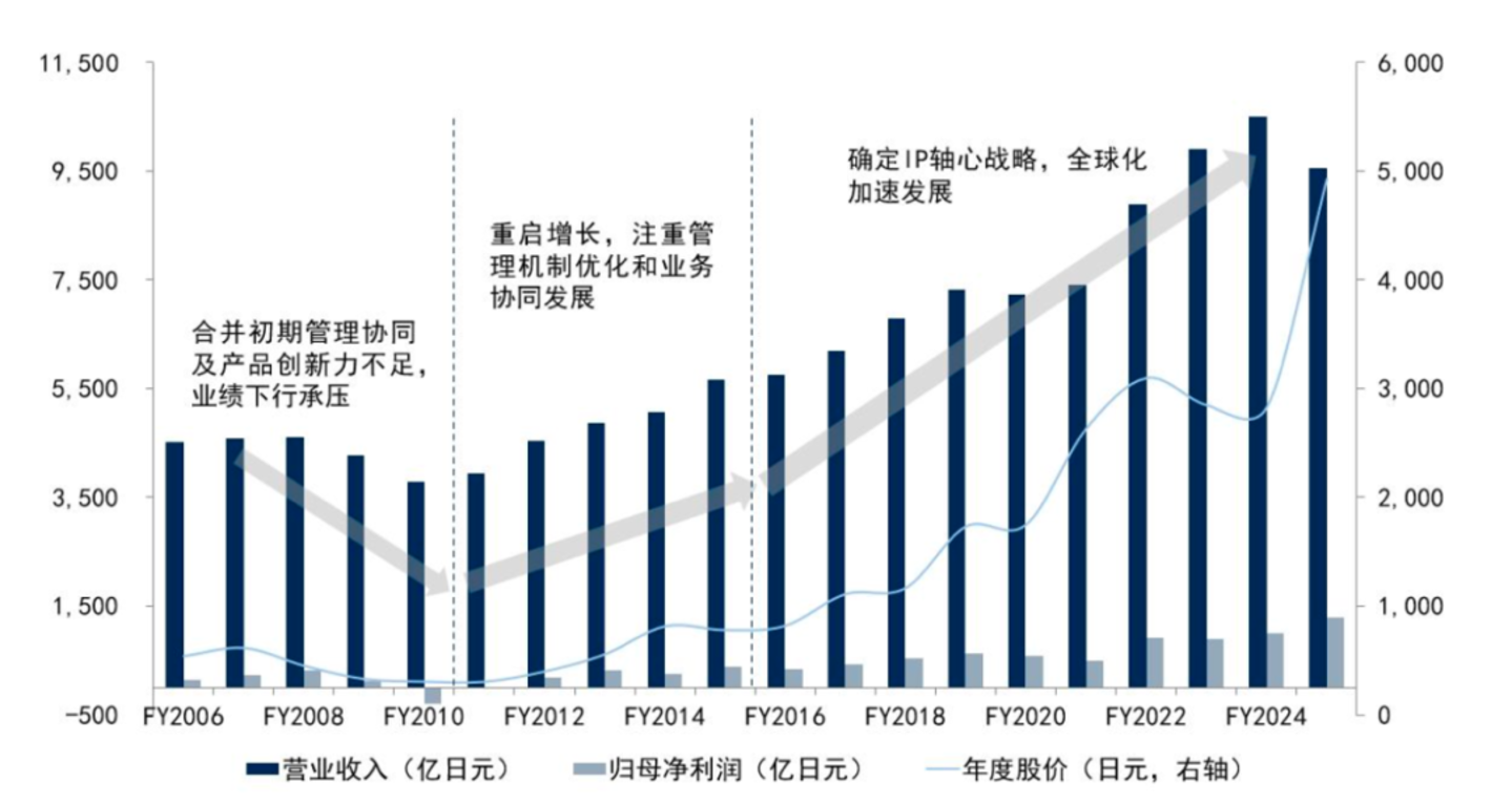 实际上,万代南梦宫自2005年合并成立以来,起初经营并不顺利,经历了五年左右的业绩震荡下滑期。