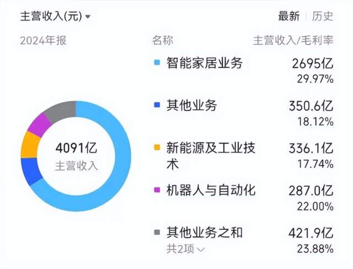 具体来看,智能家居业务收入2695.32亿元,同比增长9.4%,仍是公司的主要收入来源;新能源及工业技术业务收入336.1亿元,同比增长20.6%,增速较快但占比仍小;智能建筑科技业务收入284.7亿元,同比增长9.9%;而机器人与自动化业务收入287.01亿元,同比下降7.6%。