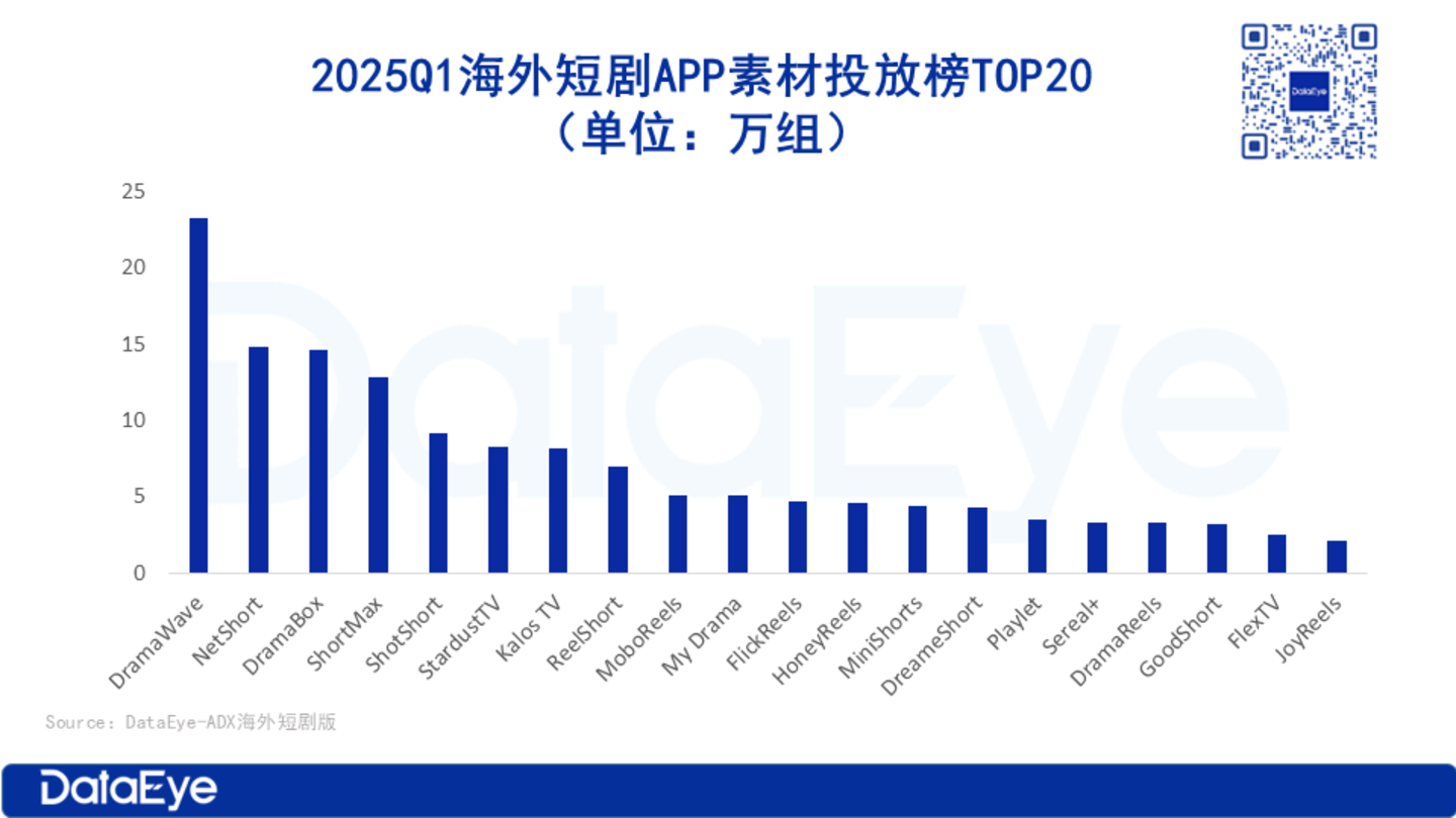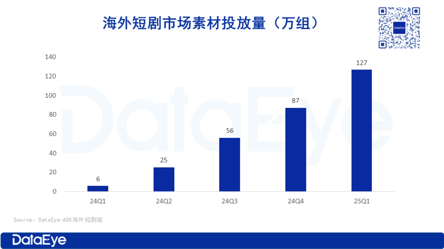 从DataEye-ADX的海外数据可知,2025年Q1,海外短剧市场投放广告素材超127万组,环比2024年Q4增长46%,同比2024年Q1激增超10倍。