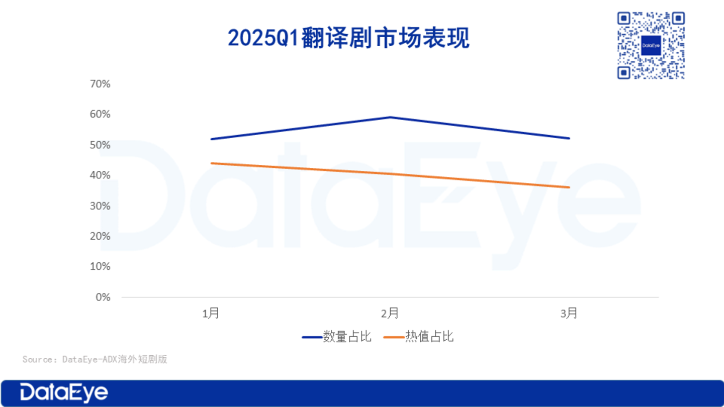 DataEye 海外短剧热榜数据显示,翻译剧在数量上占比超 50%,在热值上占比约 40%,这说明翻译剧在短剧出海中不可或缺的地位。