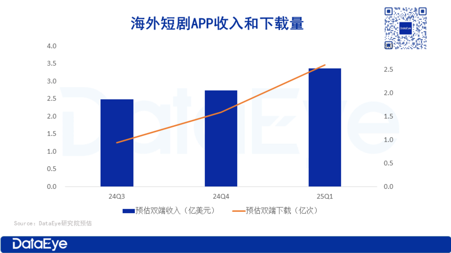 2025Q1,海外短剧APP双端内购收入超24亿人民币,下载量达2.59亿次。