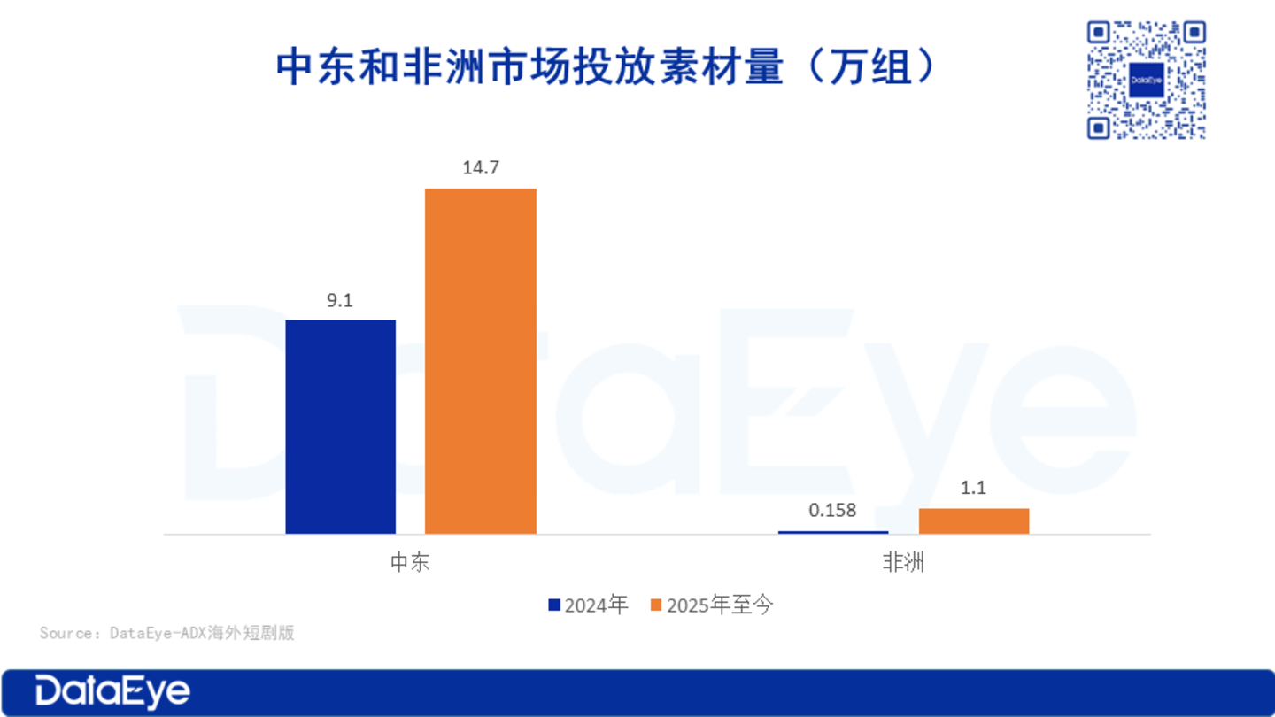 今年来,中东和非洲迅速崛起,成为微短剧出海的新热土。据 DataEye-ADX 海外数据显示,2025年以来,中东与非洲市场的短剧投放素材量呈现爆发式增长。