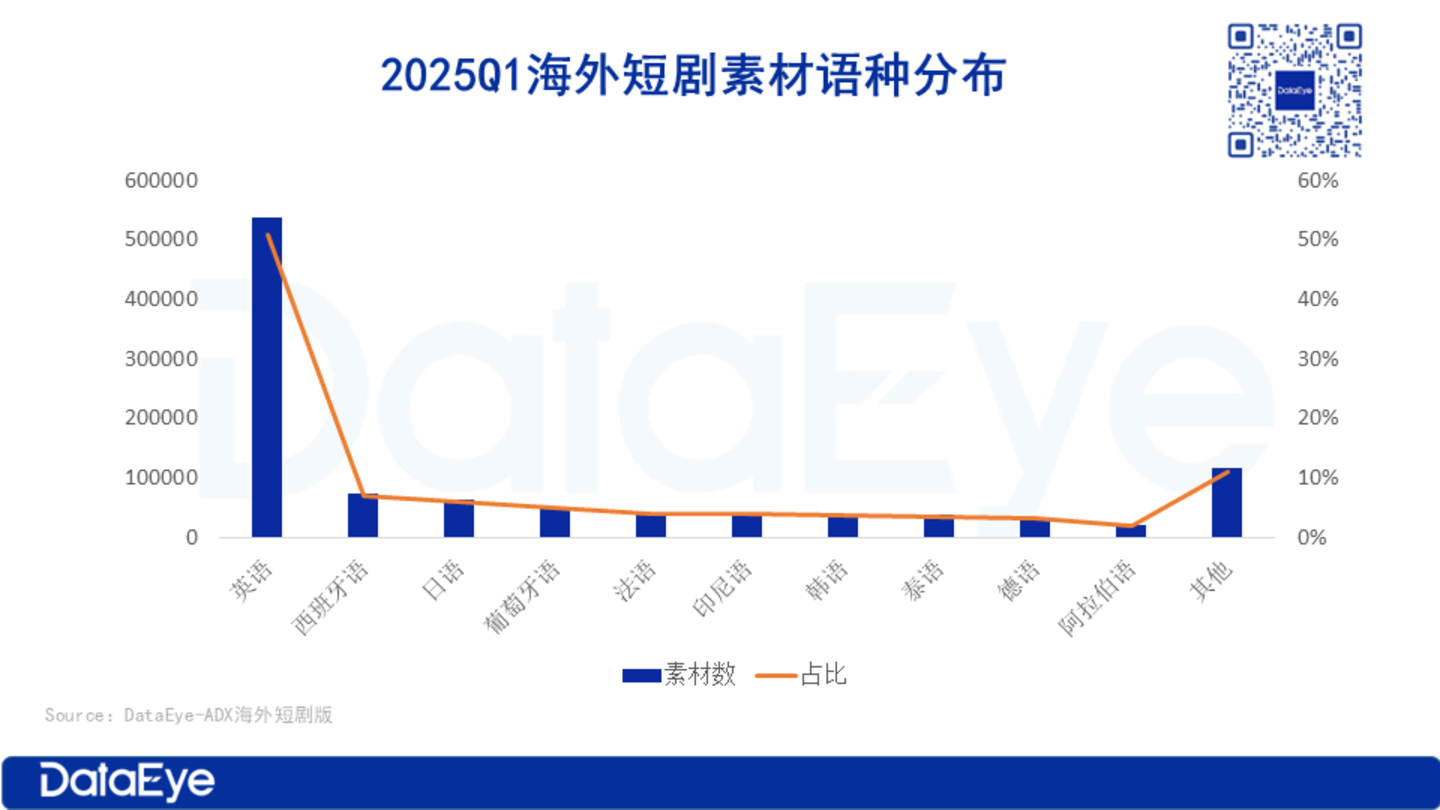 2025Q1,英语素材的投放量一骑绝尘,占比超50%,是海外短剧素材的主要语言。