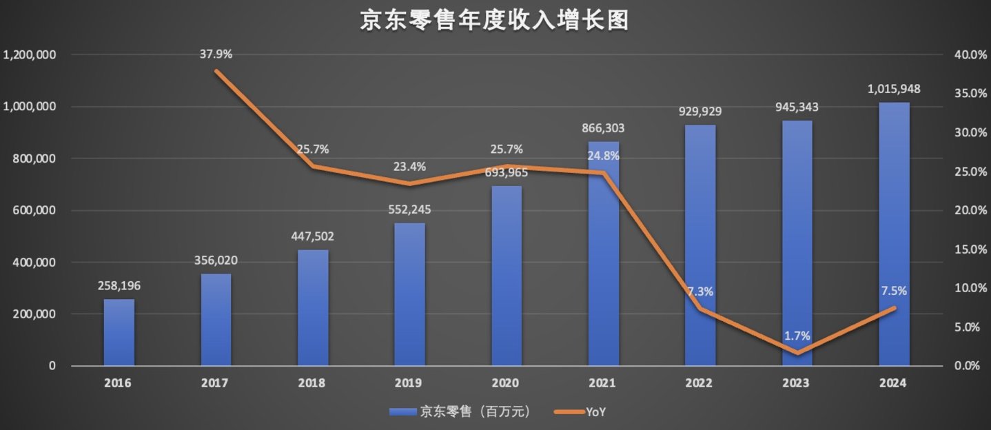 京东核心3C品类增长疲软,京东零售收入增速放缓,最近三年仅实现个位数增长,2024年京东零售收入同比增长7.5%。