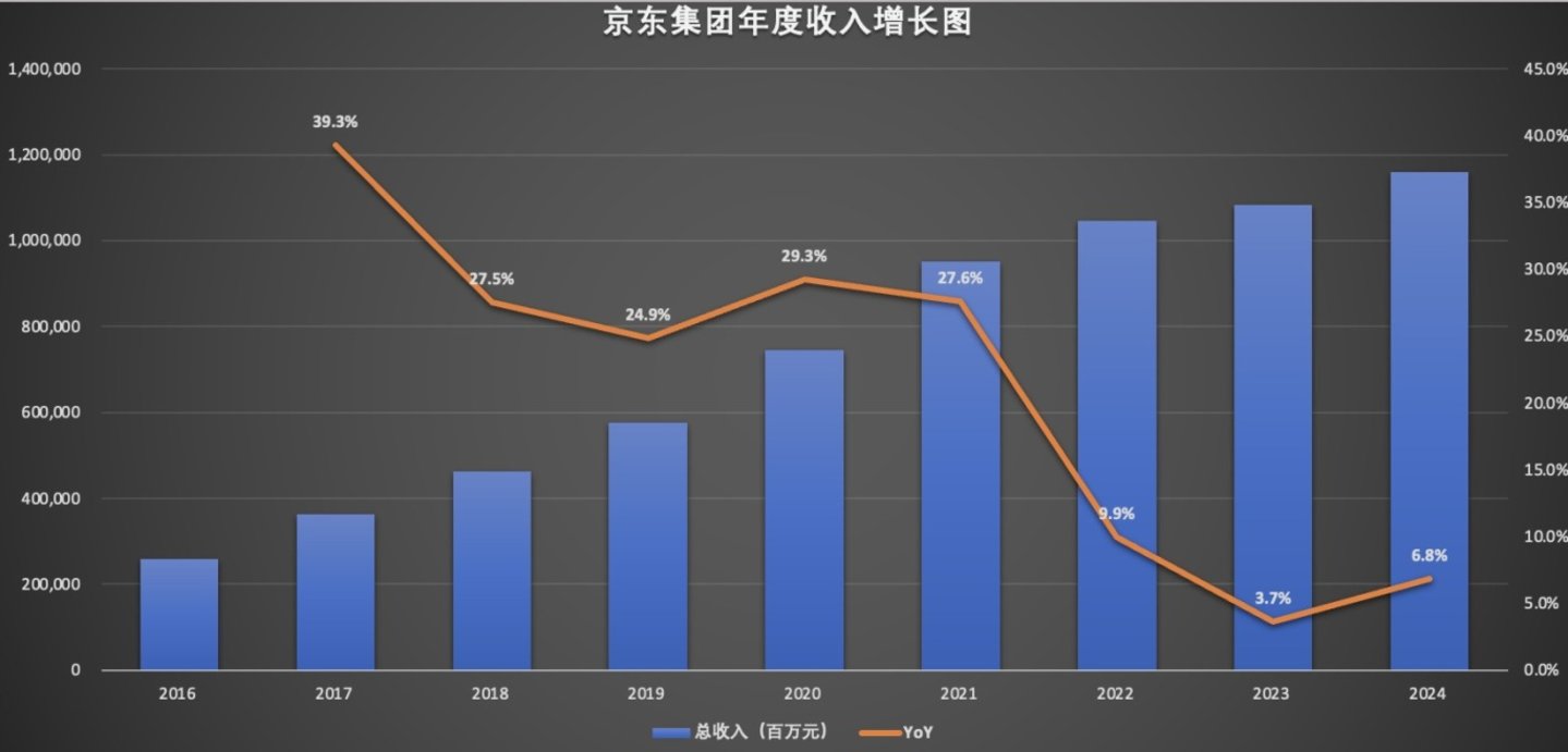 虽然最近三年京东集团净利润实现了大幅增长,但营收增速却明显放缓。从近八年的财务数据看,京东集团营收增长明显放缓,2024年度总收入同比增长6.8%,经营利润仅为3.3%。