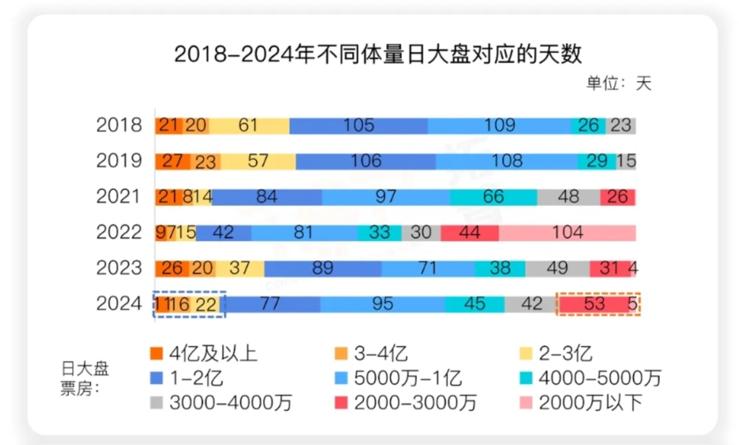 单日票房2000万以下是什么概念?过往基本上只有在影院大量暂停营业的2020年和2022年才会发生,疫情前的几年里甚至单日票房下3000万的情况都没有发生过。
