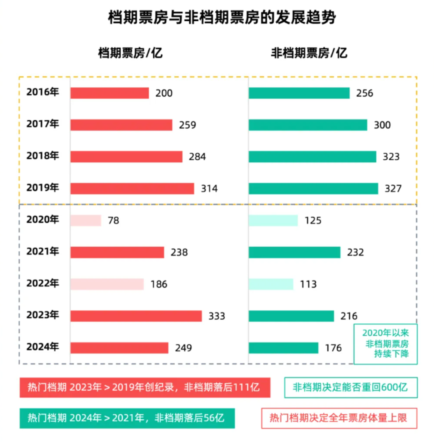 但年票房要回到480亿以上,关键就差在冷档期上。2024年的热门档期票房甚至还是高于2021年的,但冷档期票房差了56亿,若对比疫情前,已经近乎于腰斩,直接导致总账算不过来。