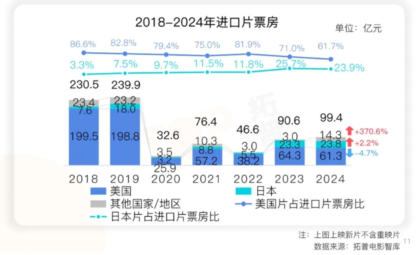 不过,2024年的进口片票房及其在全年电影票房中的占比其实同比已经有所回升,只不过回升的主角并非以好莱坞为代表的美国电影,而是日本电影与其他国家/地区电影齐齐发力。