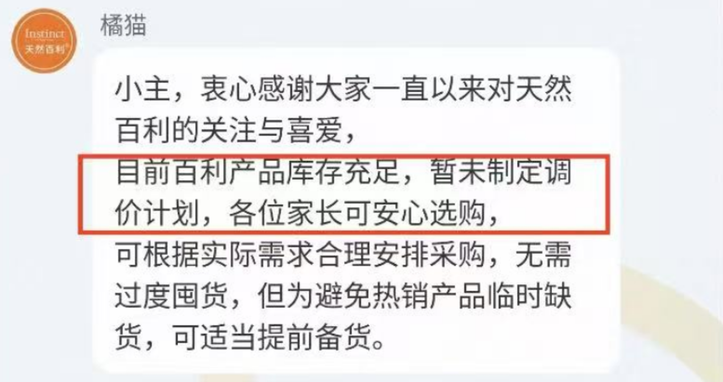 目前几个在国内知名度颇高的美国宠粮品牌的官方旗舰店,都已经通过不同方式发布公告,称产品库存充足,暂时没有调定价计划,请宠主们放心选购。