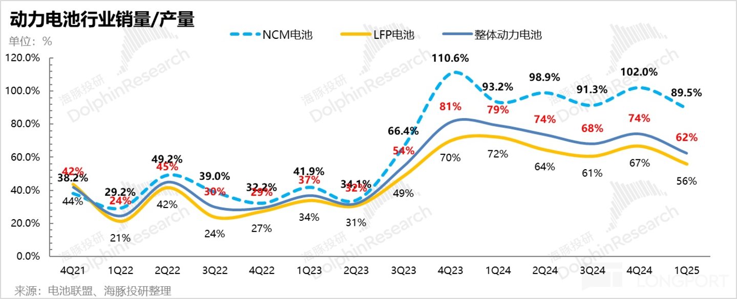 从锂电整体行业角度来看,不同于 2023 年四季度看到的动力电池行业销量/产量呈现的一个快速上行趋势,呈现出一个相对明显的拐点,也是宁王上轮股价从阶段性周期低点开始反弹的时间(2024 年 3 月左右宁王股价开始反弹,映射在宁王自身经营指标的是产能利用率开始同比回升),目前行业销量/产量一直在 70% 上下波动,而今年一季度这个比值还在略有下滑,尤其是 LFP 电池的产销差还在扩大,供给侧还仍然处于产能过剩状态,锂电行业没有看到明显的 beta 侧的拐点,仍需要持续跟踪。