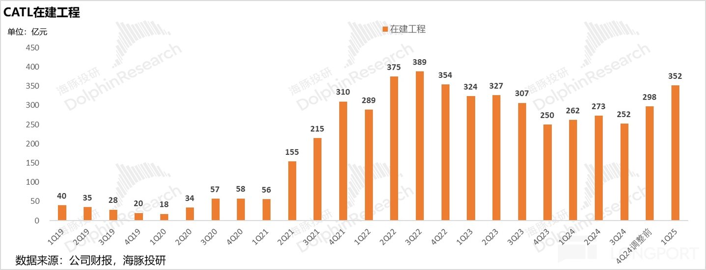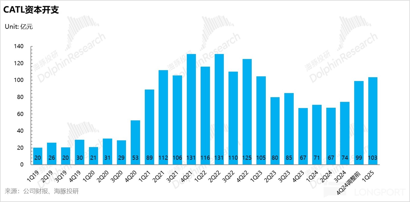 但自 2024 年三季度开始,宁王就开始增加了资本支出,到 2025 年一季度达到了阶段性新高 103 亿元,同时从宁王的在建工程来看,宁王的在建工程环比上季度还要增加 54 亿元至本季度 352 亿元,海豚君认为在建产能增加可能为 2025 年的新品周期增加以及换电站的建设在做准备,今年动力电池神行电池和麒麟电池会集中出货,从去年占比 3-4 成,到今年占比 6-7 成,而增混电池骁晓去年年底发布,已配套了 30 多款车型,2025 年搭载骁晓的车型也会在 2025 年集中上市。