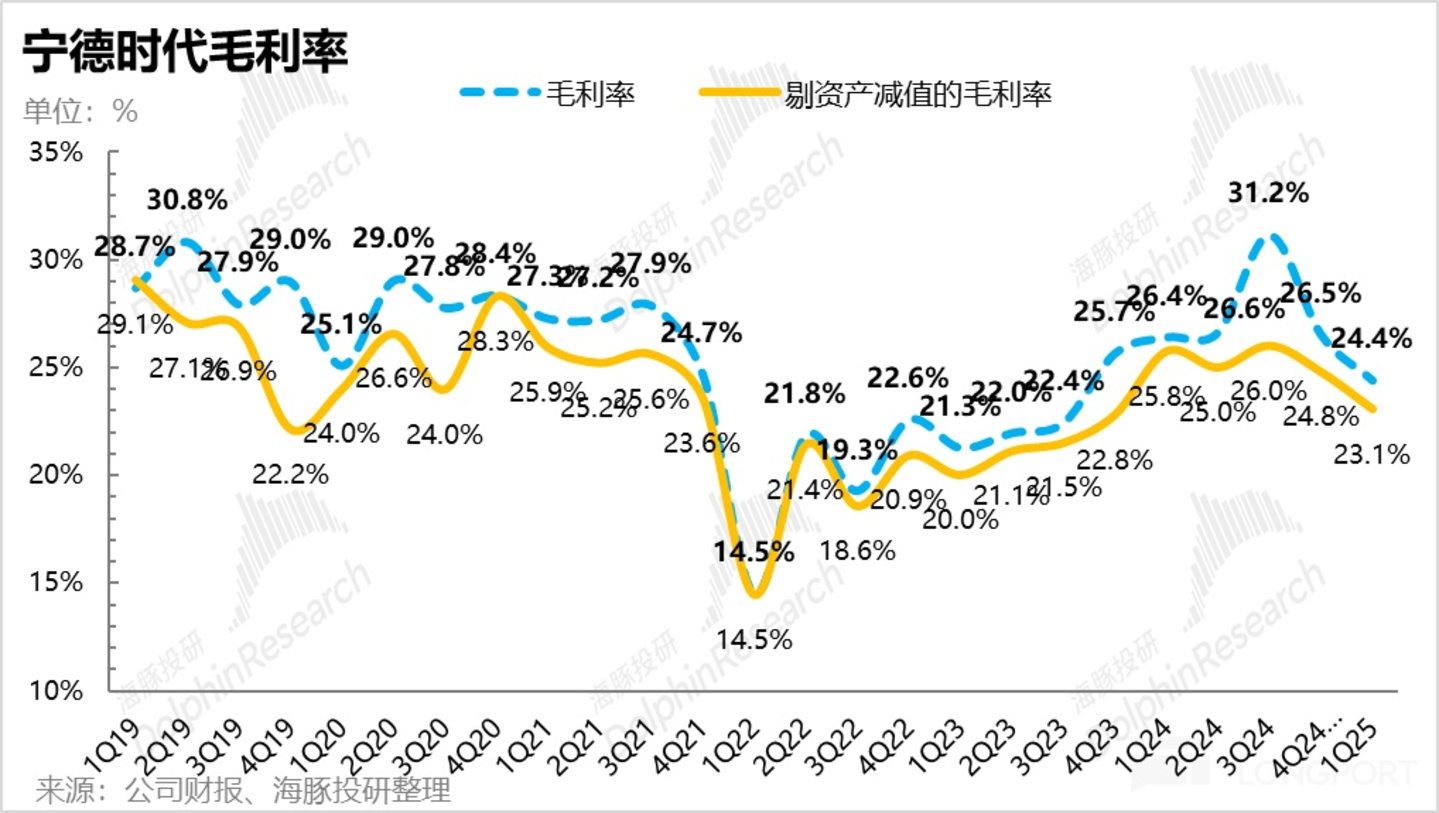 从宁王毛利率端口径来看,毛利率环比去年 Q4 实际 23%-24%(将销售费用质保金纳入销售成本后,与 1Q25 在会计口径一致下的数据)还略微环比上行了,本季度实际毛利率 24.4%,也超出市场 22.1% 的毛利率预期,所以毛利率端表现还可以。