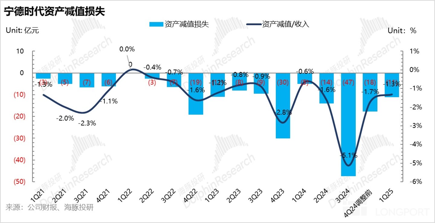 2025 年一季度资产减值 11 亿,环比上季度 18 亿继续下滑 7 亿,由于宁王的资产减值主要分为: