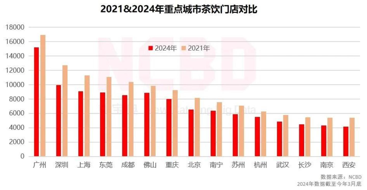 以去年净赚44亿的蜜雪冰城为例,截至去年底,该品牌在全球门店总数超过了4.6万家,仅用一年就多开了8914家,开店速度快但闭店速度同样不低,蜜雪冰城2024年平均每新开5.9家店就会有1家关闭。再从餐宝典监测的十五个城市来看,2024年茶饮门店数相对2021年平均减少1457.9家,对此,行业普遍认为一线城市市场接近饱和。